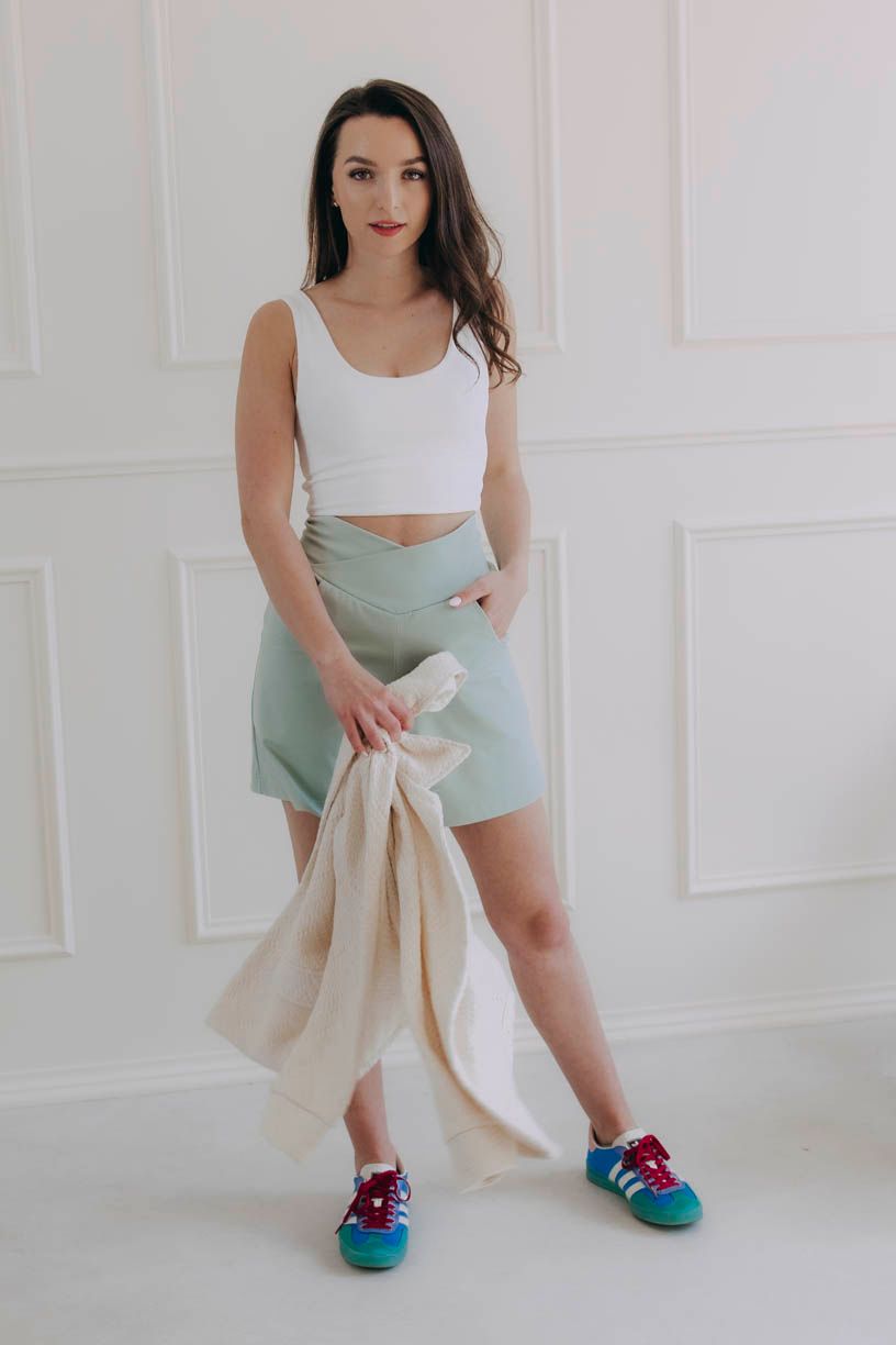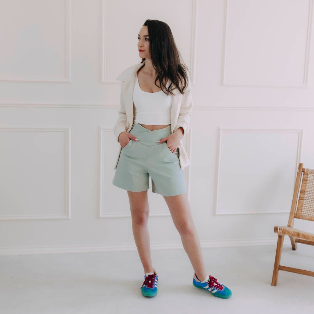 Mentolová má zvláštny dar: stačí málo a celý deň pôsobí pokojnejšie a svetlejšie. Stačí pár krokov v kraťasoch Selas Mint a človek sa cíti, akoby práve vyšiel z tienistého parku rovno na slnečnú ulicu. Top Hema v ecru odtieni k tomu pridáva jemnosť a čisté línie. Prilieha k telu tak akurát, aby vytvoril ideálny základ pod blejzer. A nie len tak hocijaký, ale Asili Ecru Pure. Ten vďaka svojej textúrej pridá celému outfitu nádych mäkkosti. Je to kombinácia, ktorá má ľahkosť a zároveň drží formu. Na schôdzku, na vybavovačky v meste, letnú vernisáž, brunch i na deň, keď chcete stíhať veľa a cítiť sa dobre.
