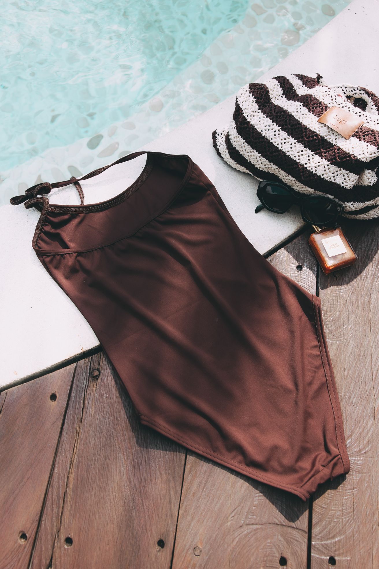 Hľadáte plavky, ktoré spájajú dokonalé pohodlie, ženský šarm a kvapku retro elegancie? Jednodielne plavky Amira v sýtom čokoládovom odtieni sú pre vás ako stvorené. Dominantným prvkom tohto modelu je rafinované zaväzovanie za krkom, ktoré krásne odhaľuje ramená a šiju, a vytvára tak očarujúcu siluetu. Hlboká hnedá farba navyše fantasticky podčiarkne vaše opálenie a dodá plážovému outfitu nádych luxusu.