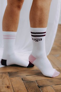 Biely základ dopĺňa kontrastná špička a päta. Farebný je aj horný lem, ktorý navyše zdobia typické bugácke atribúty - prúžky, logo, bavlník - každú farbičku niečo trošku iné.