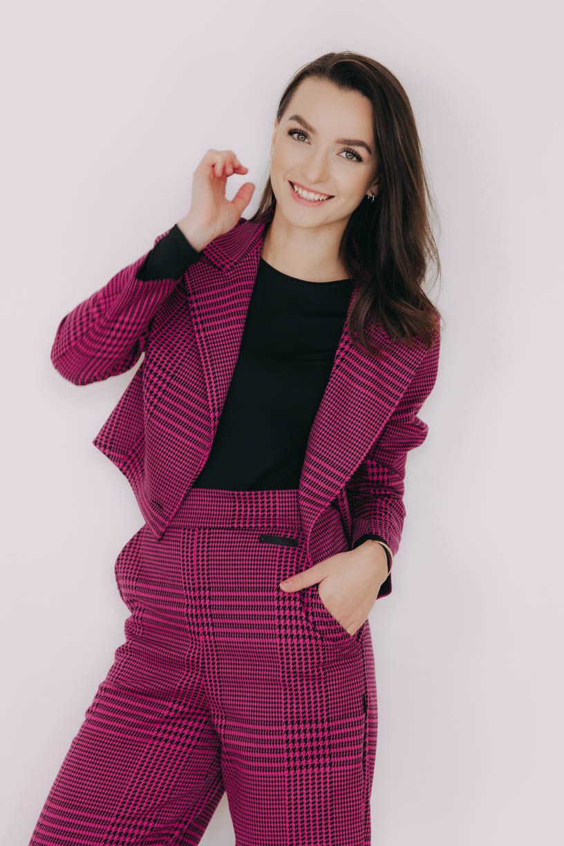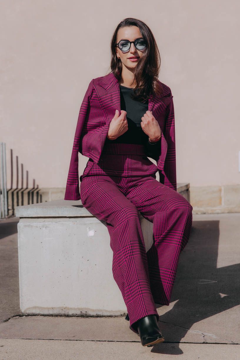Cropnuté sako Aris zaujme nevšedným strihom s gombíkmi v spodnej časti a výrazným golierom. S nohavicami Kiu Fuchsia z rovnakej látky tvoria nerozlučnú dvojku