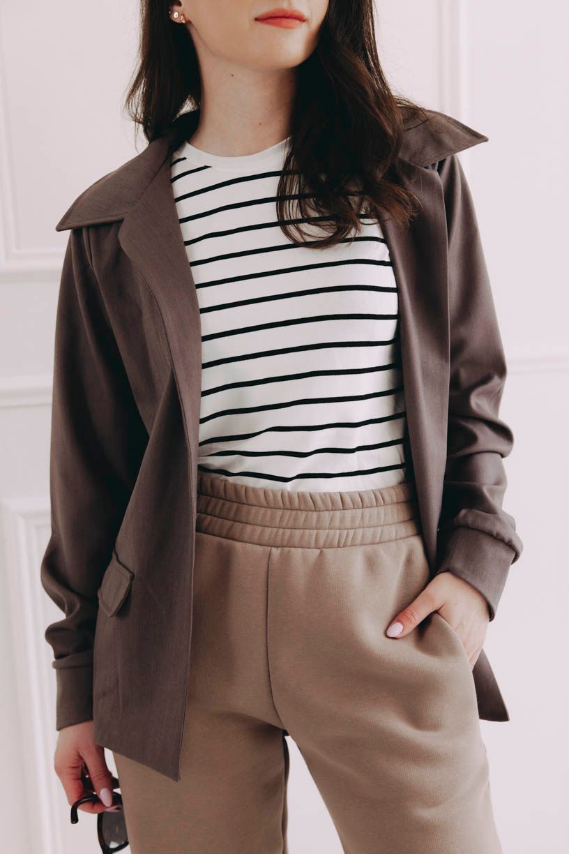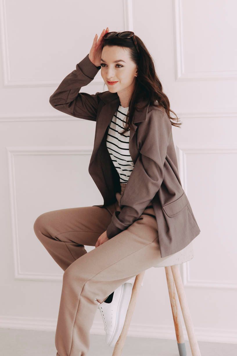 Strihovo je Ikenna trošku kontrastné – klasická léga a klopa pri fake/praktickom vrecku sú elegantnými prvkami, ktoré naša Peťa sofistikovane doplnila mohutnými a tak trochu oversized rukávmi.