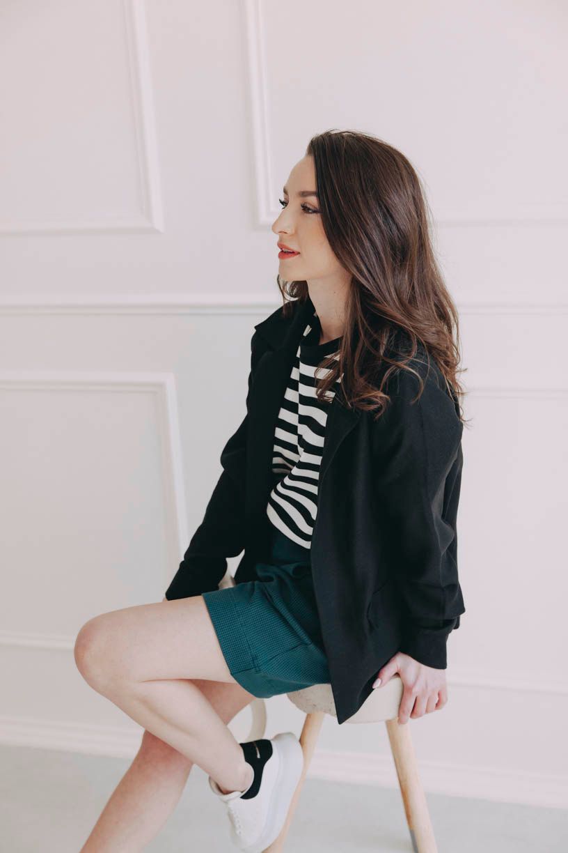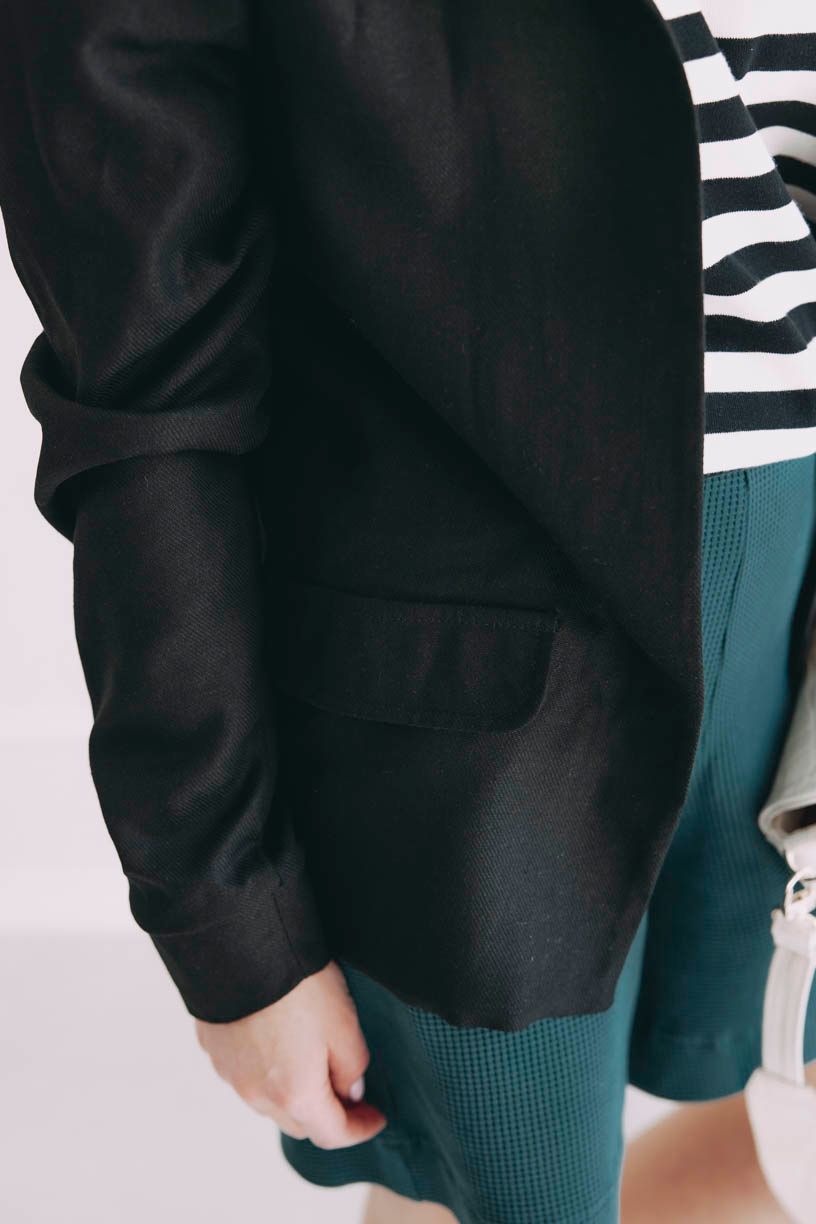 Strihovo je Ikenna trošku kontrastné – klasická léga a klopa pri fake/praktickom vrecku sú elegantnými prvkami, ktoré naša Peťa sofistikovane doplnila mohutnými a tak trochu oversized rukávmi.