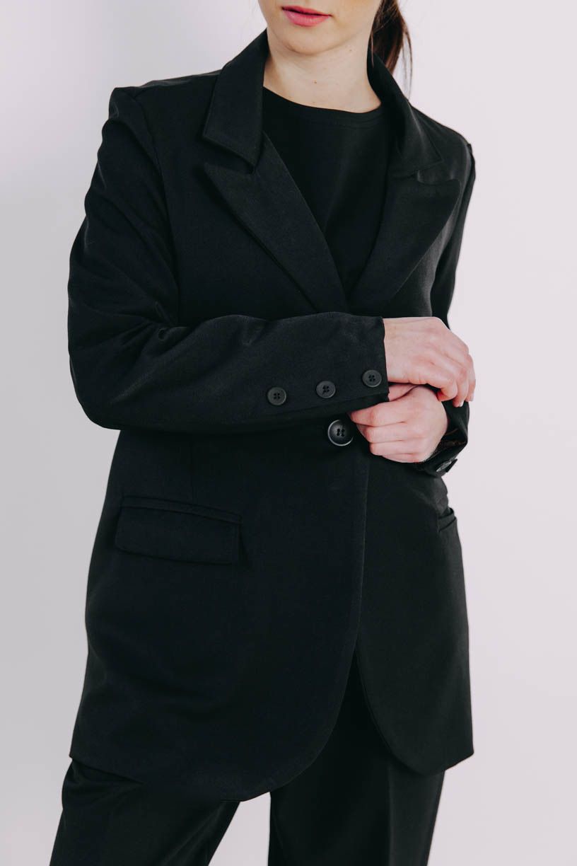 Hoci je oversized, v ramenách pekne sedí ženskej postave a okolo pŕs a hrudníka pekný tvar umocňujú záševky. Sako neobopína boky, ale smerom dolu má rovný strih a na chrbte rozparok. Môžete ho nosiť voľne prehodené, alebo zapnúť gombík. Trojicu gombíkov sme našli aj na rukávy s rozparkami. rozparek na zadním díle. Nechýbajú ani dve vrecká. Zvolili sme obľúbené a elegantné výpustkové vrecká. Mene je celé vypodšívkované a použitý polyester sa postará, aby sa nekrčilo ani počas toho najvyťaženejšieho dňa.