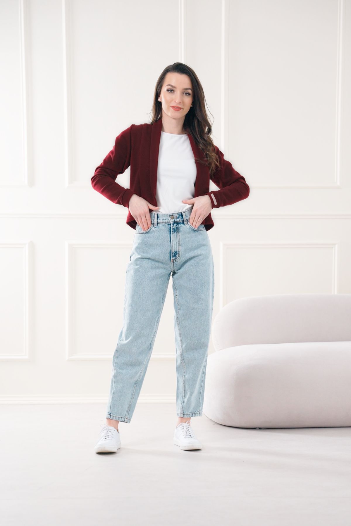 - Ležérne k džínsom: Ak hľadáte recept na dokonalý mestský outfit, prehoďte ho cez basic tričko k obľúbeným džínsom s vysokým pásom. Práve tento kontrast elegantného saka a džínsoviny vytvára ten vyhľadávaný "effortless" look. Stačí obuť tenisky a môžete vyraziť dobýjať ulice.