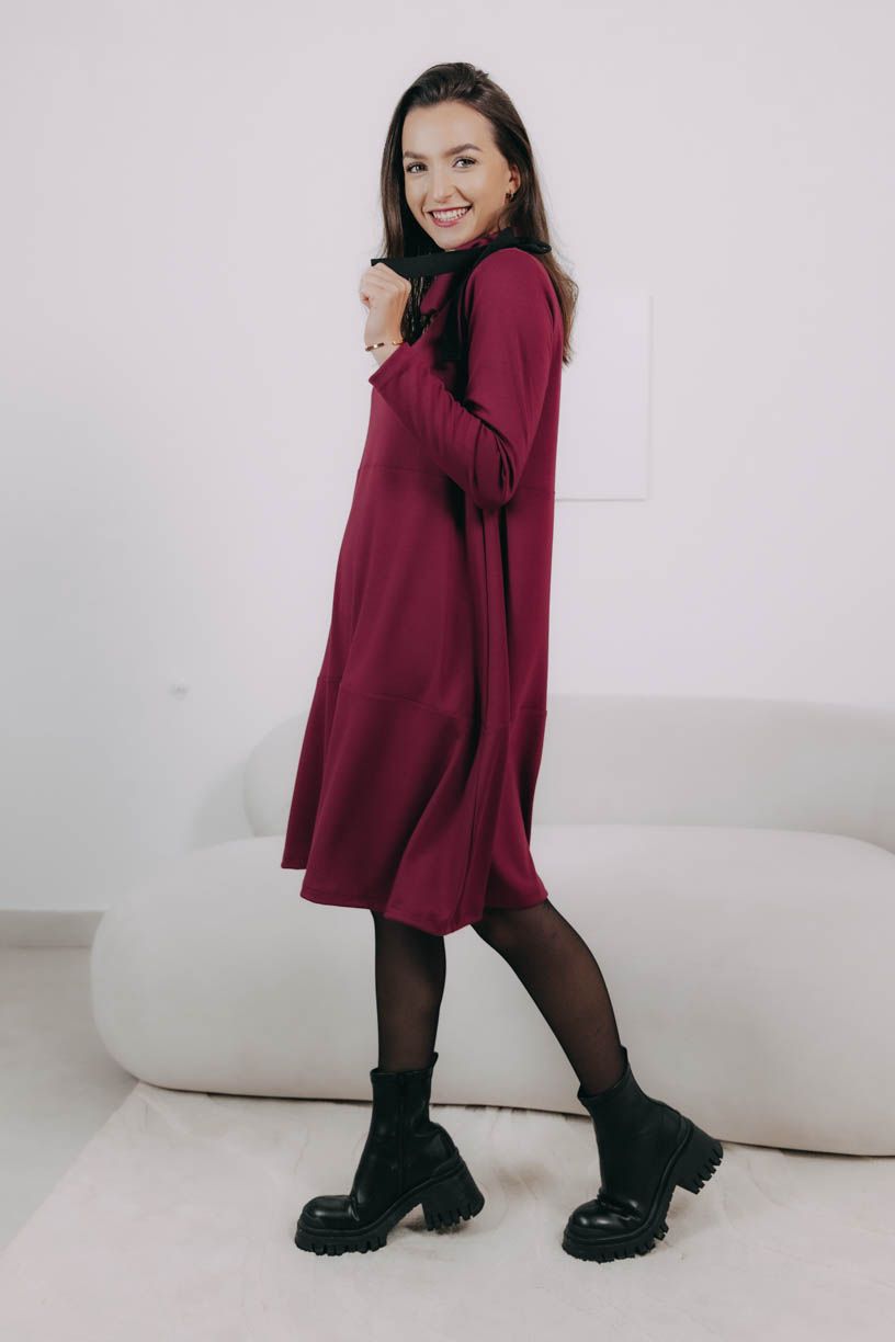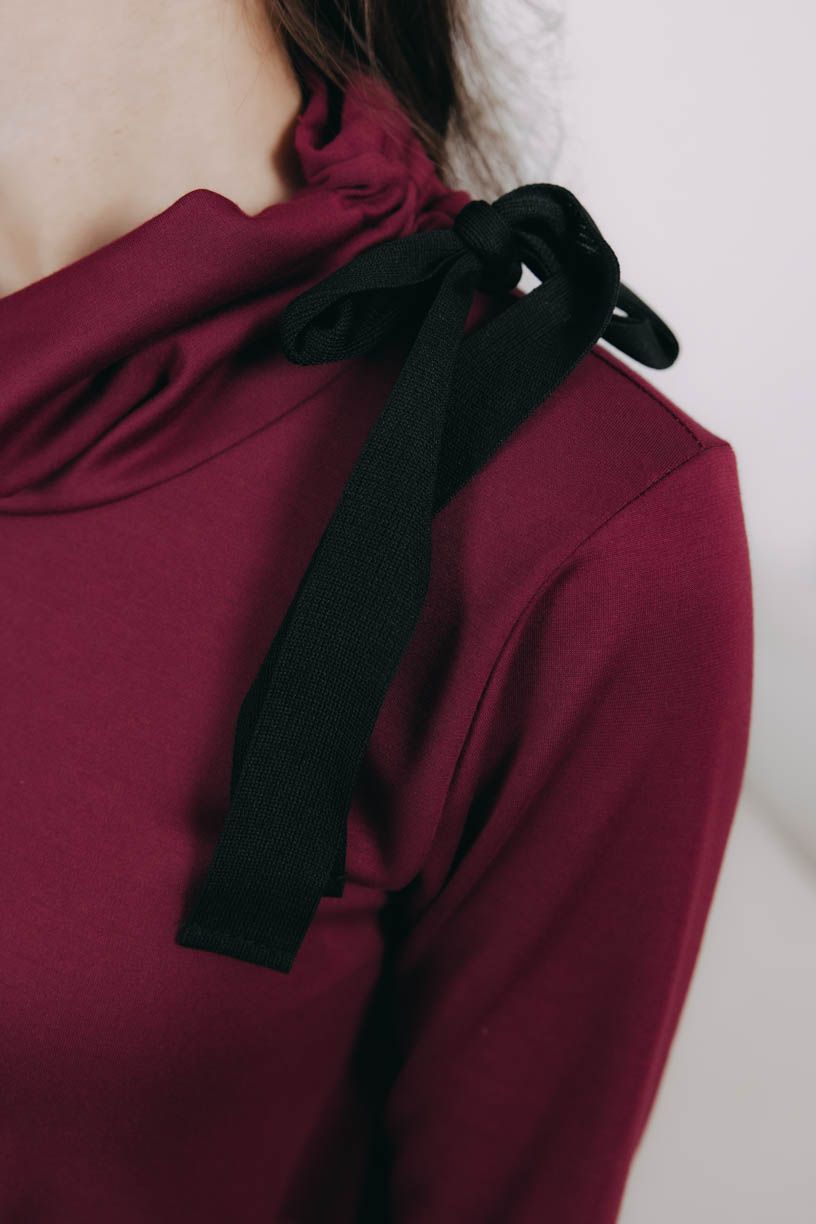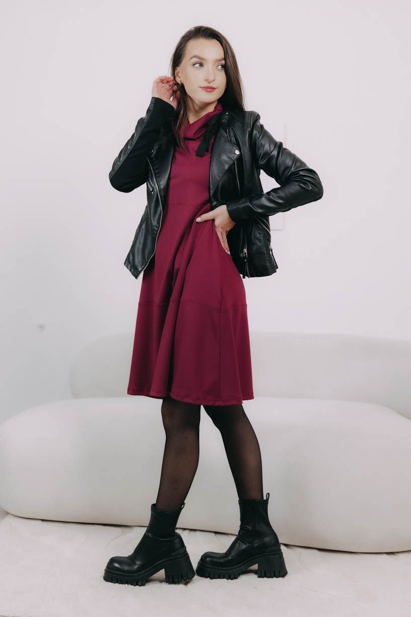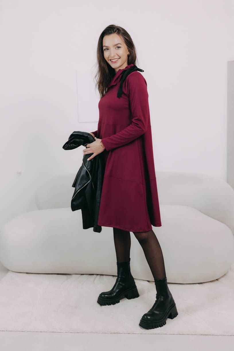 Trendy bordó s čiernou mašľou môžete kombinovať celkom jednoducho. Keď vyrazíte na schôdzku, natiahnite vzorované čierne pančuchy, biker boots a sačko. Do práce telové silonky, vysoké pohodlné čižmy a kabátik a na výlet s priateľmi potom pokojne zateplené legíny, poriadne topánky a teplú bundu.