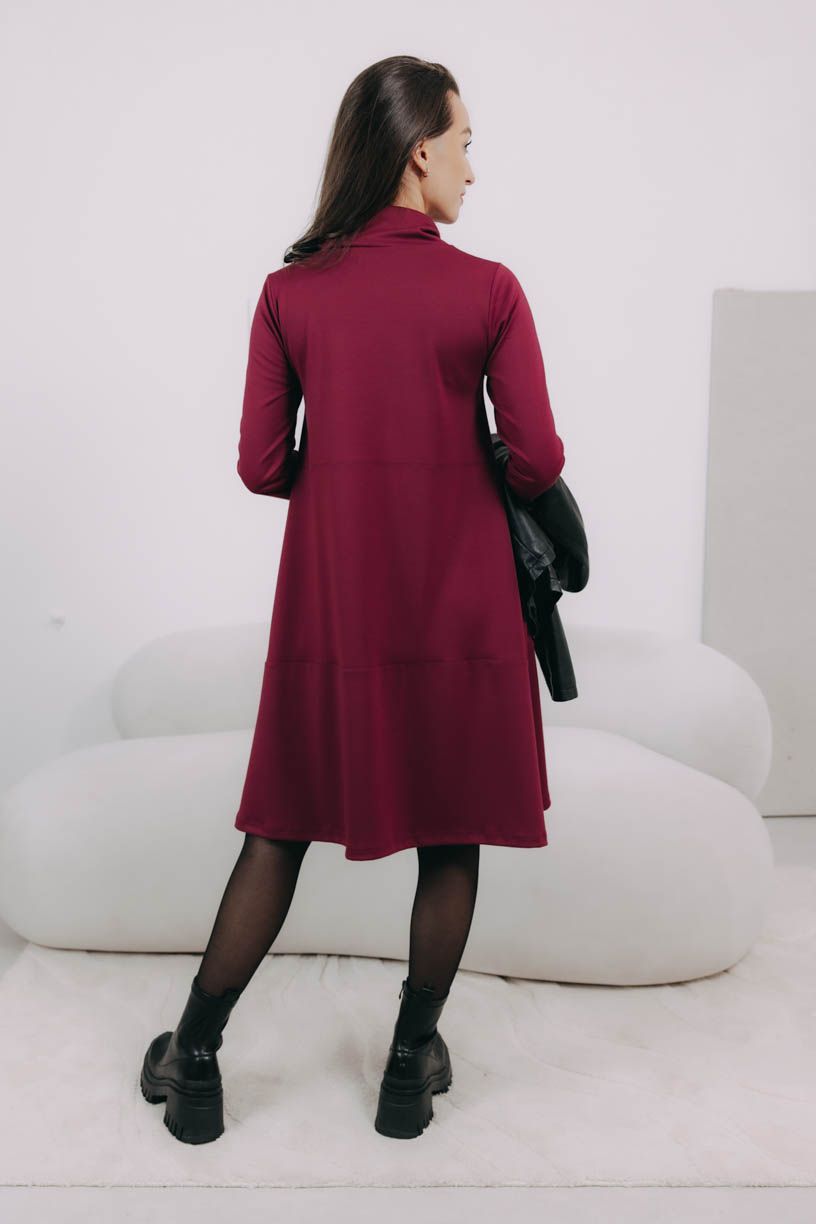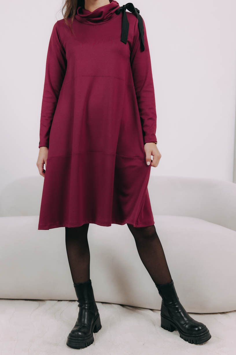 Hrejivé šaty Addo po kolená zaujmú hlavne efektným a praktickým rolákom, ktorý sa dá stiahnuť mašľou umiestnenou na ramene. Ideálka do chladnejších dní.