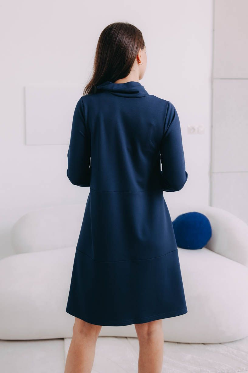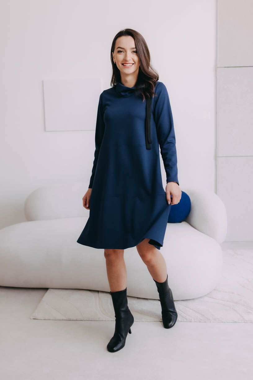 Hrejivé šaty Addo po kolená zaujmú hlavne efektným a praktickým rolákom, ktorý sa dá stiahnuť mašľou umiestnenou na ramene. Ideálka do chladnejších dní.