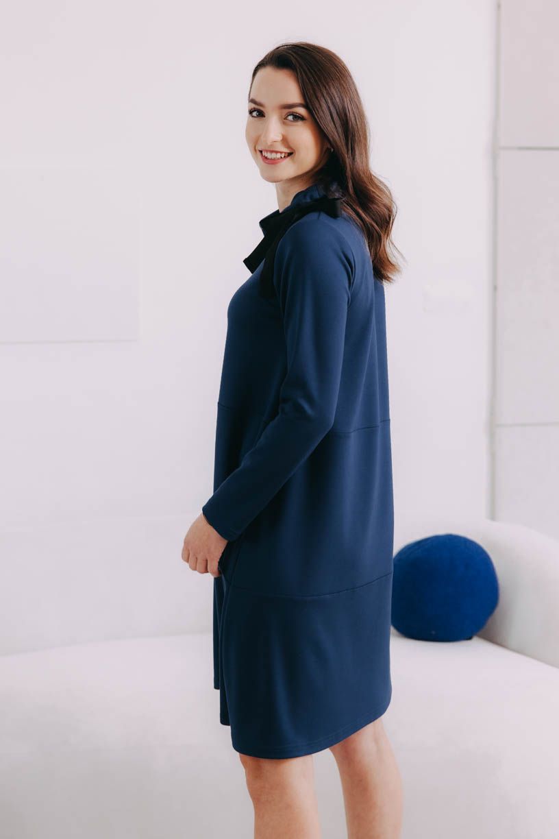 Na prvý pohľad neprehliadnuteľná mašľa na ramene nie je len pre efekt – stiahnete si s ňou praktický a šmrncovný rolák, keď práve fúkne alebo sa počasie jednoducho postaví tak trochu proti nám. Príjemný a odolný materiál je podobný tomu, z ktorého sme ušili naše stálice Audrey. A práve látka spolu s dlhými rukávmi a celkovou dĺžkou po kolená robí z Addo šaty do nepohody, aby vás zasa dostali do pohody.