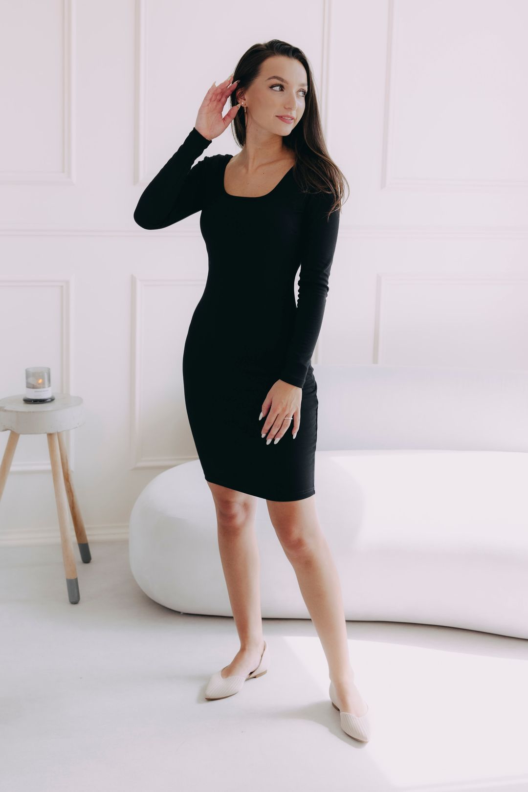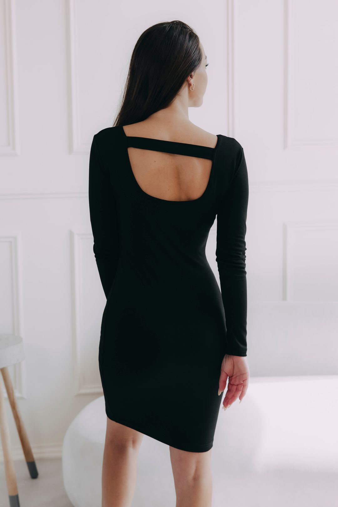 Šaty Asani s priliehavým strihom, dlhými rukávmi a dych vyrážajúcim výstrihom na chrbte vytvárajú sebavedomý look, v ktorom sa budete zároveň cítiť neuveriteľne pohodlne.
