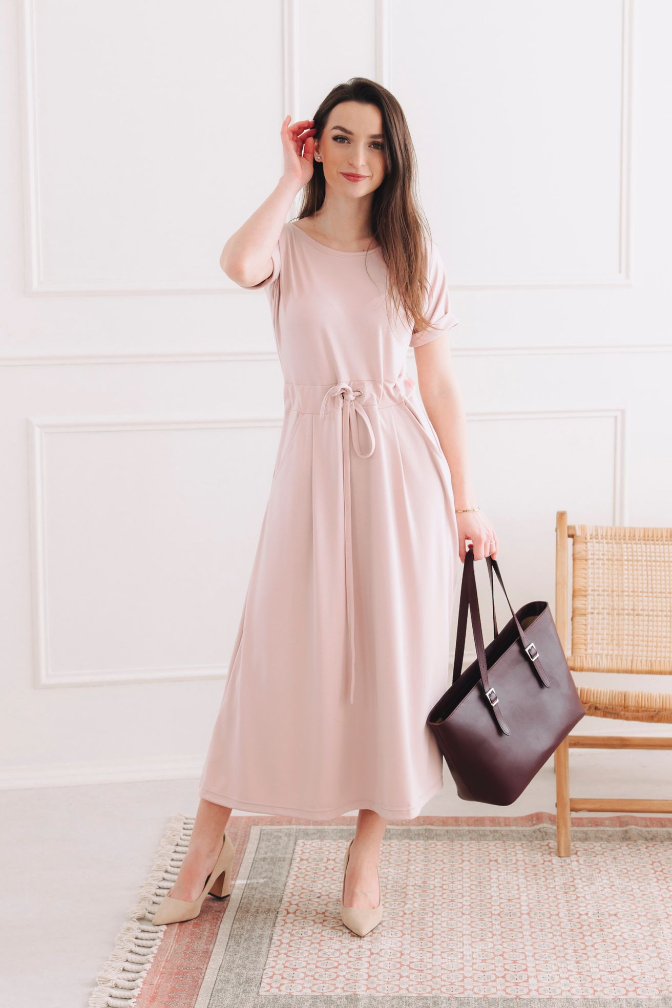 Audrey nie sú len krásne na pohľad – sú premyslené do posledného detailu. Vďaka sťahovacej šnúrke si šaty ľahko upravíte presne na svoju postavu. Rozumne riešené rukávy s mierne padnutými ramenami, lodičkový výstrih, vrecká a midi dĺžka – to všetko z nich robí sofistikované, praktické a neodolateľné šaty, ktoré vám dodajú sebavedomie.