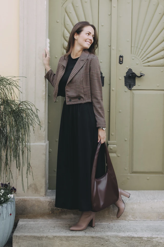 - Office & Galéria: Elegantný set vytvoríte s kratším sakom alebo blejzrom v kontrastnej farbe (napríklad karamelová). Decentný výstrih podčiarknete výrazným, ale minimalistickým náhrdelníkom a obujte si topánky na nízkom podpätku.