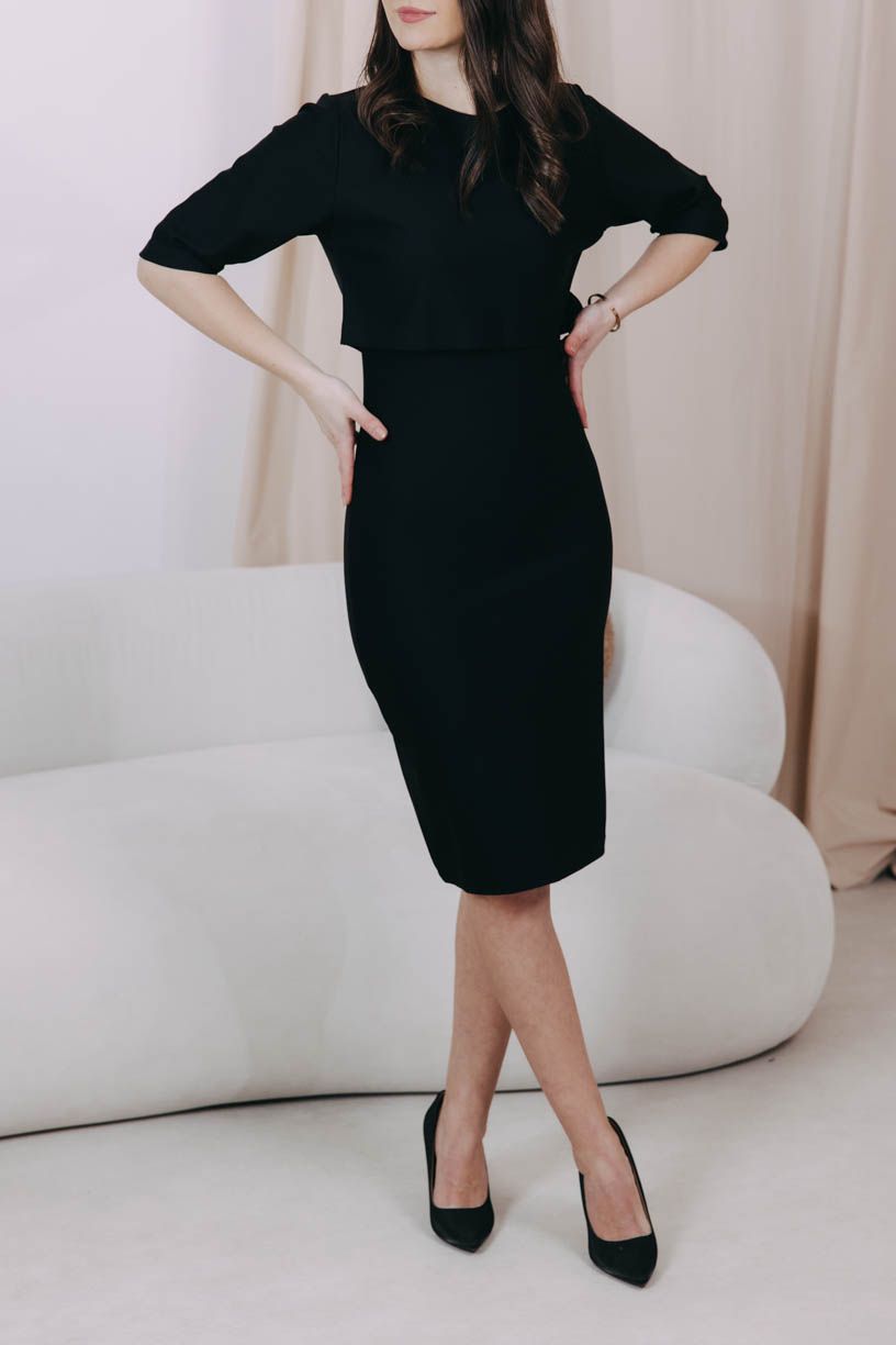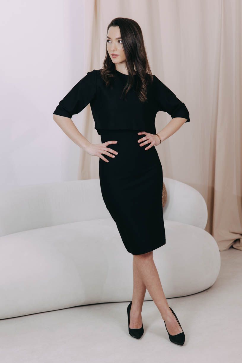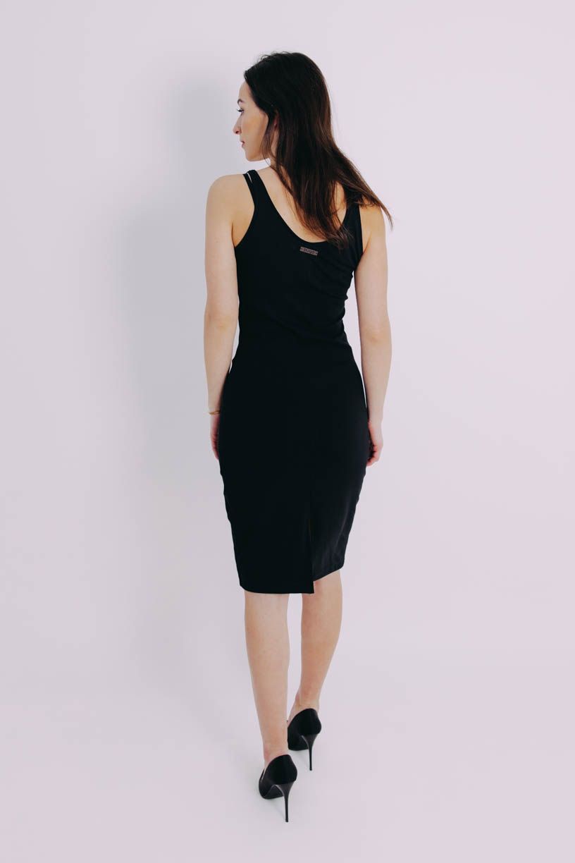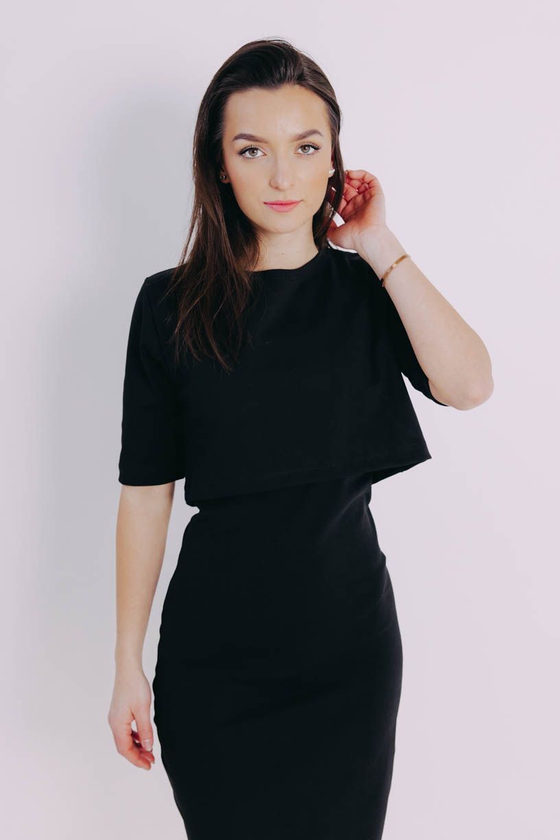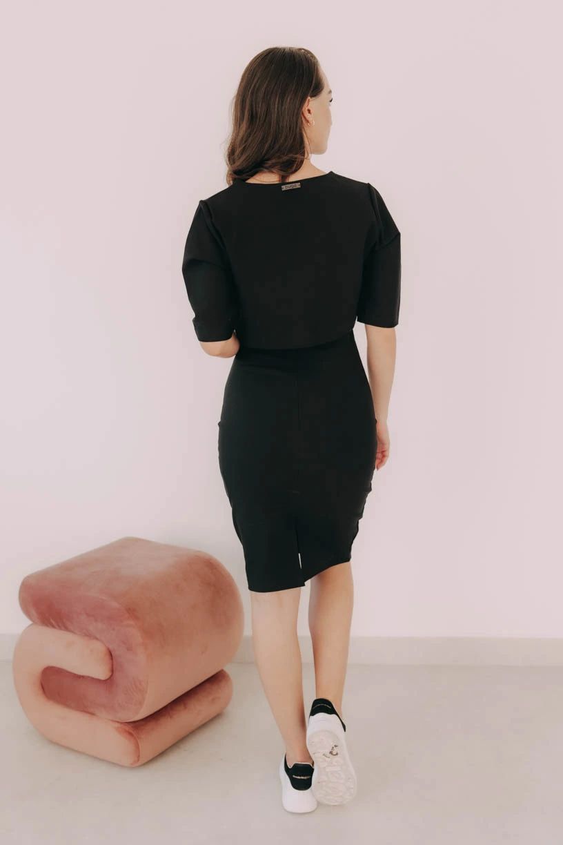 Obopnuté čierne šaty Mandisa s dĺžkou ku kolenám, rozparkom a okrúhlym výstrihom plus crop top Azmera – jasný basic pre všetky milovníčky módneho minimalizmu.