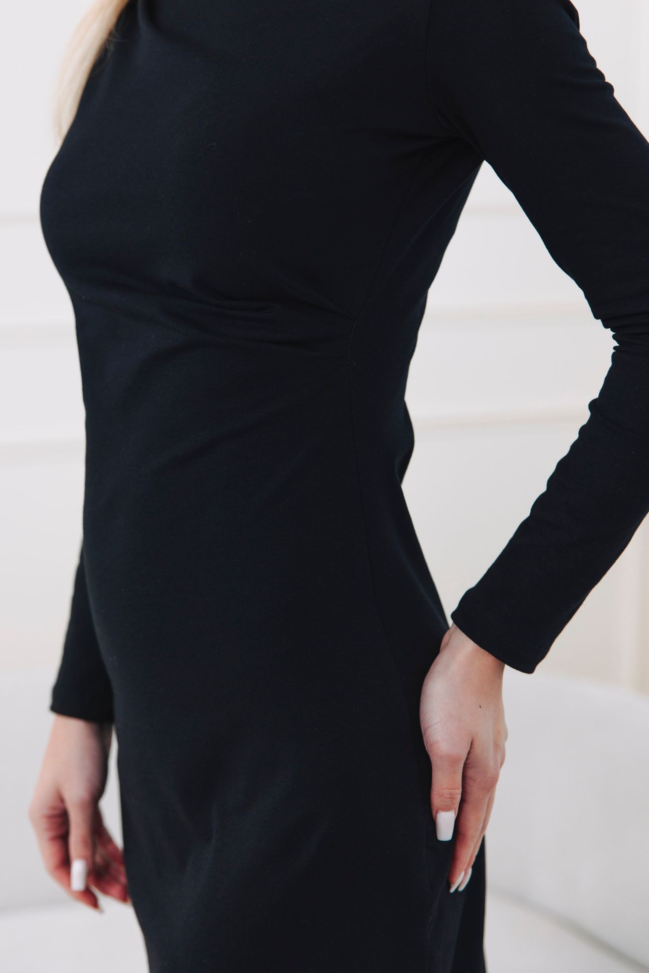 Nemajú a má to svoj dobrý dôvod. Aby asymetrické riasenie v páse aj na ramene perfektne sedelo a línia šiat zostala čistá a elegantná, rozhodli sme sa vrecká vynechať. Vďaka tomu šaty nikde neodstávajú, nepridávajú objem tam, kde ho nechceme, a vy v nich vyzeráte úplne dokonale z každého uhla. Telefón alebo rúž tentoraz zverte svojej obľúbenej listovej kabelke.