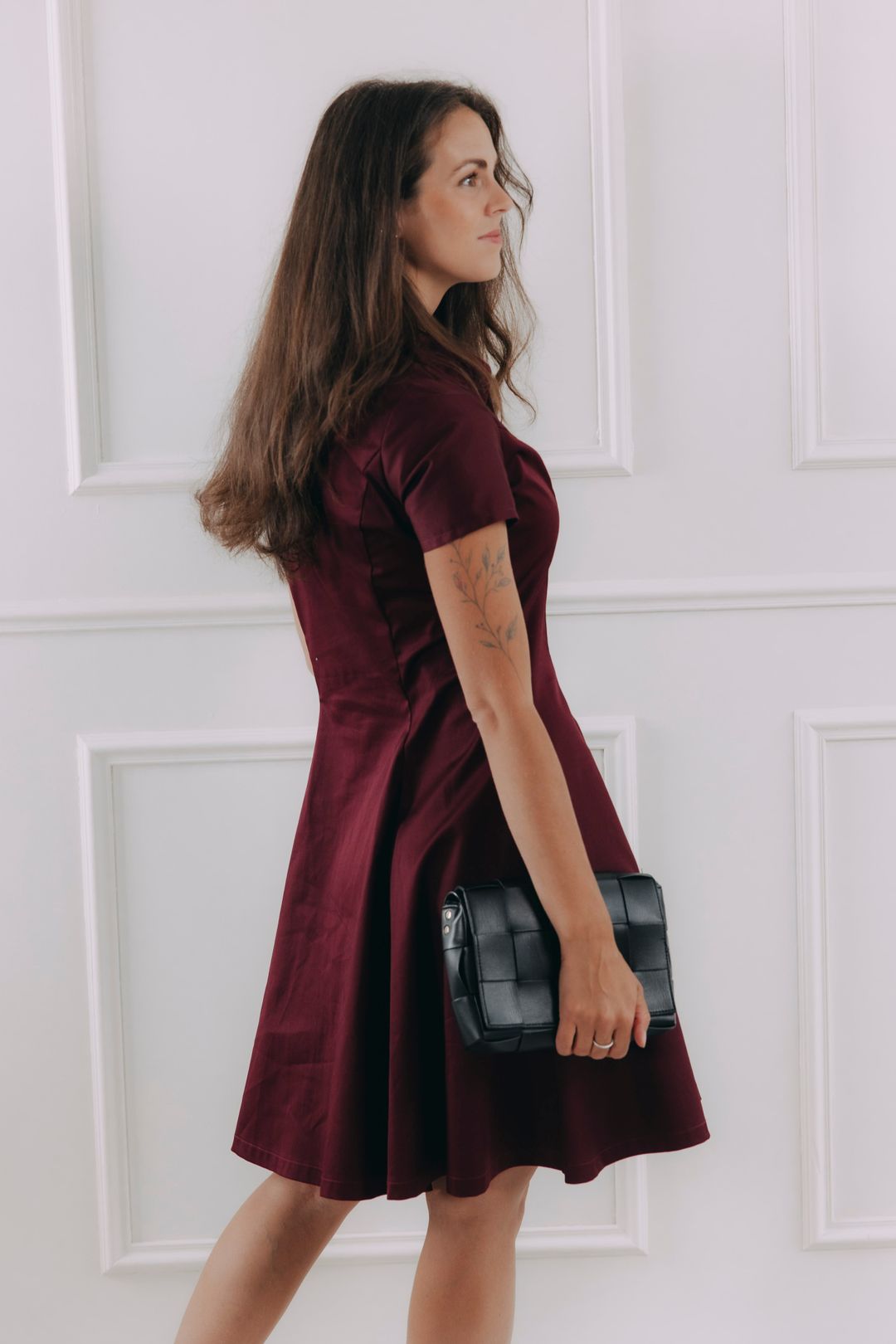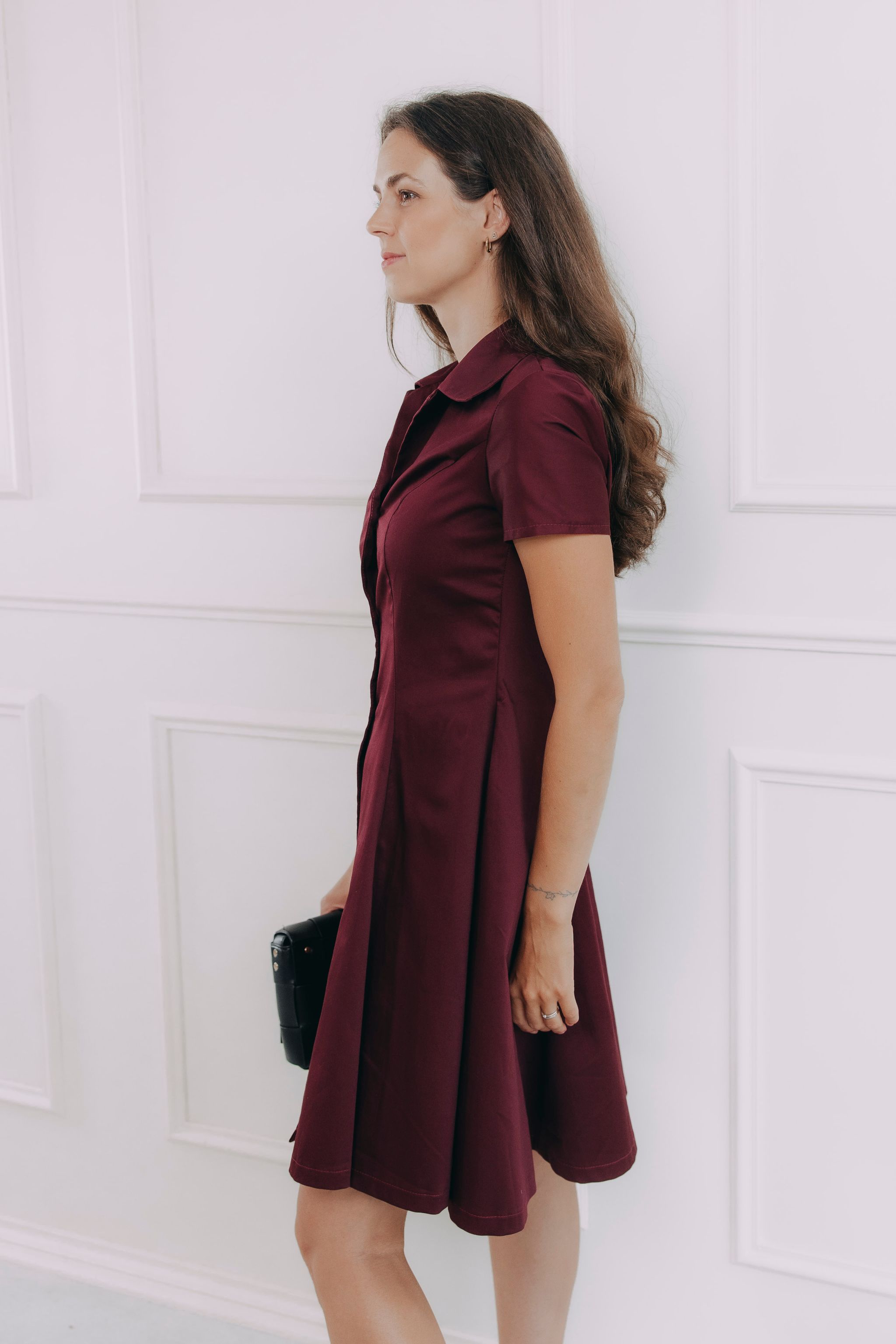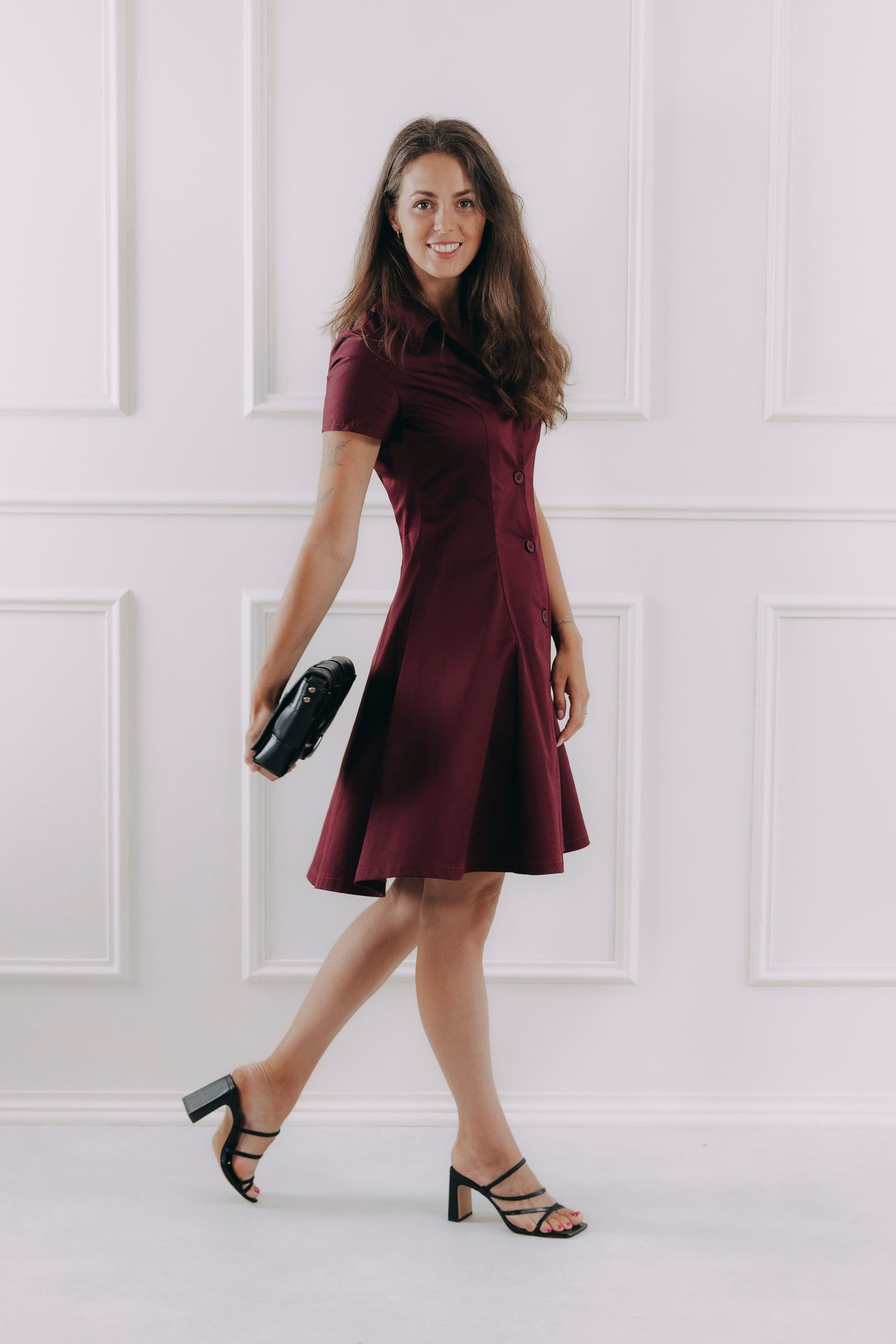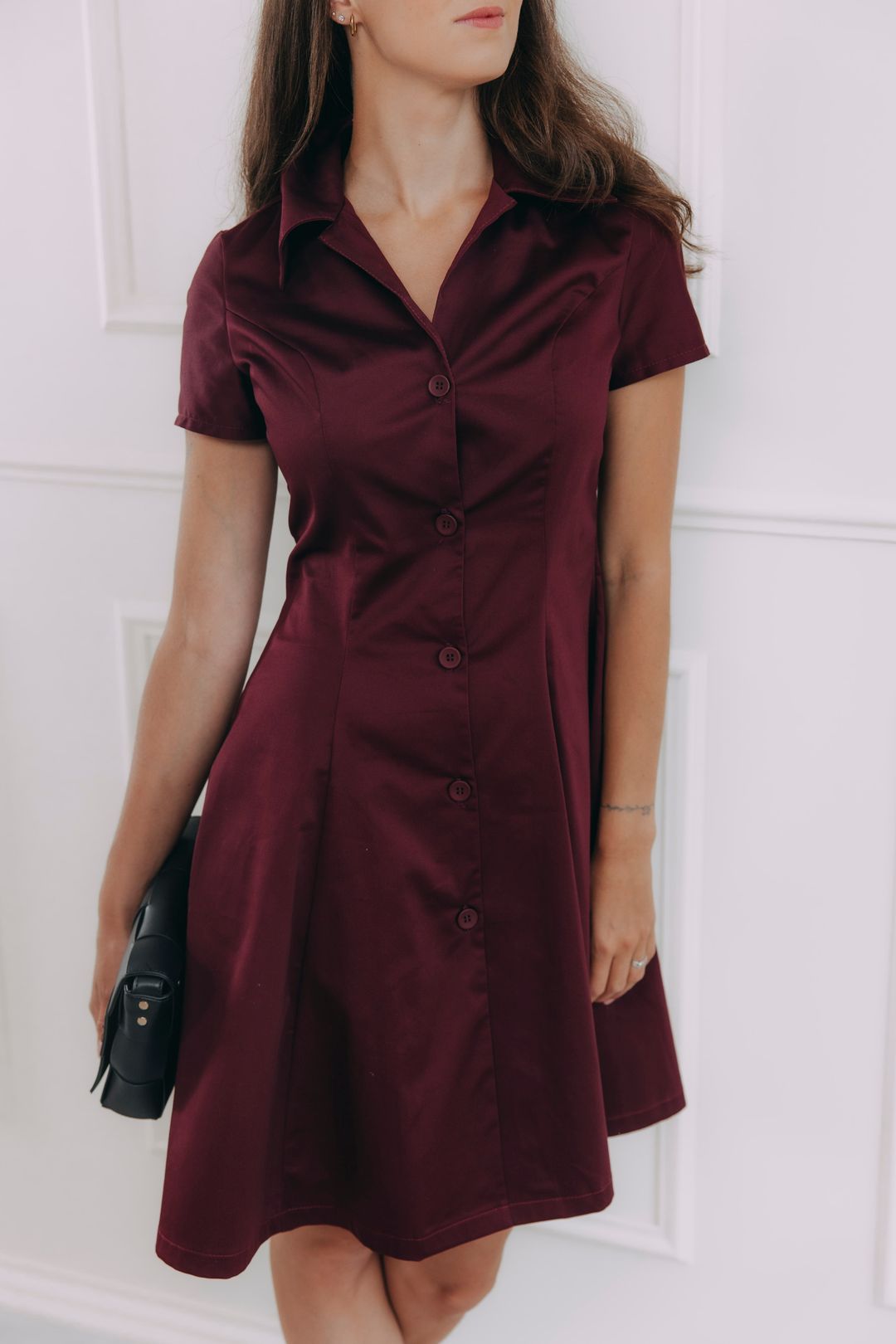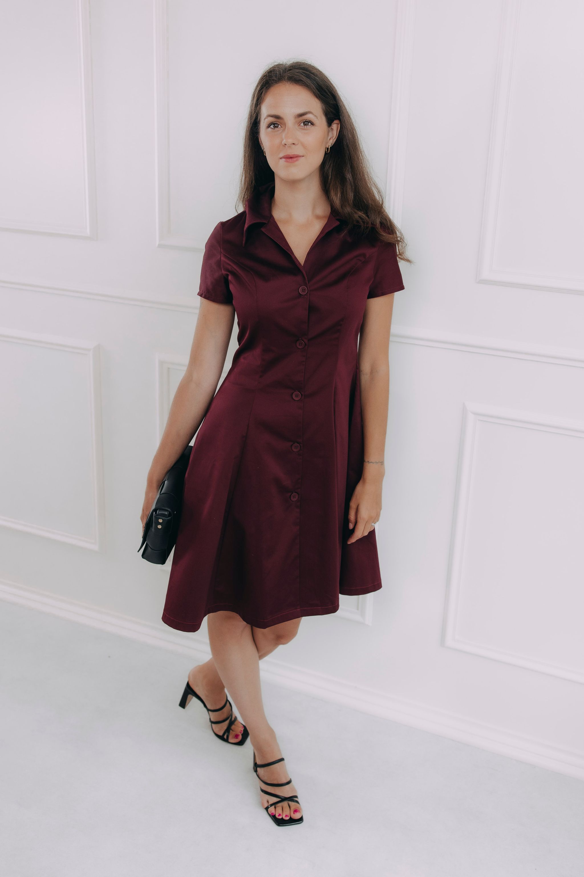 Tieto košeľové šaty v sýto bordovom odtieni vedia rozsvietiť šatník aj náladu. Majú klasický golier, gombíky a nadčasový áčkový strih, ktorý lichotí postave a nikdy nevyjde z módy. Premyslené záševky vytvarujú siluetu tak akurát, aby podčiarkli, čo majú a nebránili vám pri chôdzi, posedávaní pri káve ani dobiehaní na MHD. Jemný splývavý materiál s nenápadným leskom vyzerá luxusne, ale nosí sa úplne prirodzene – ako by ste práve vystúpili z obálky Vogue.