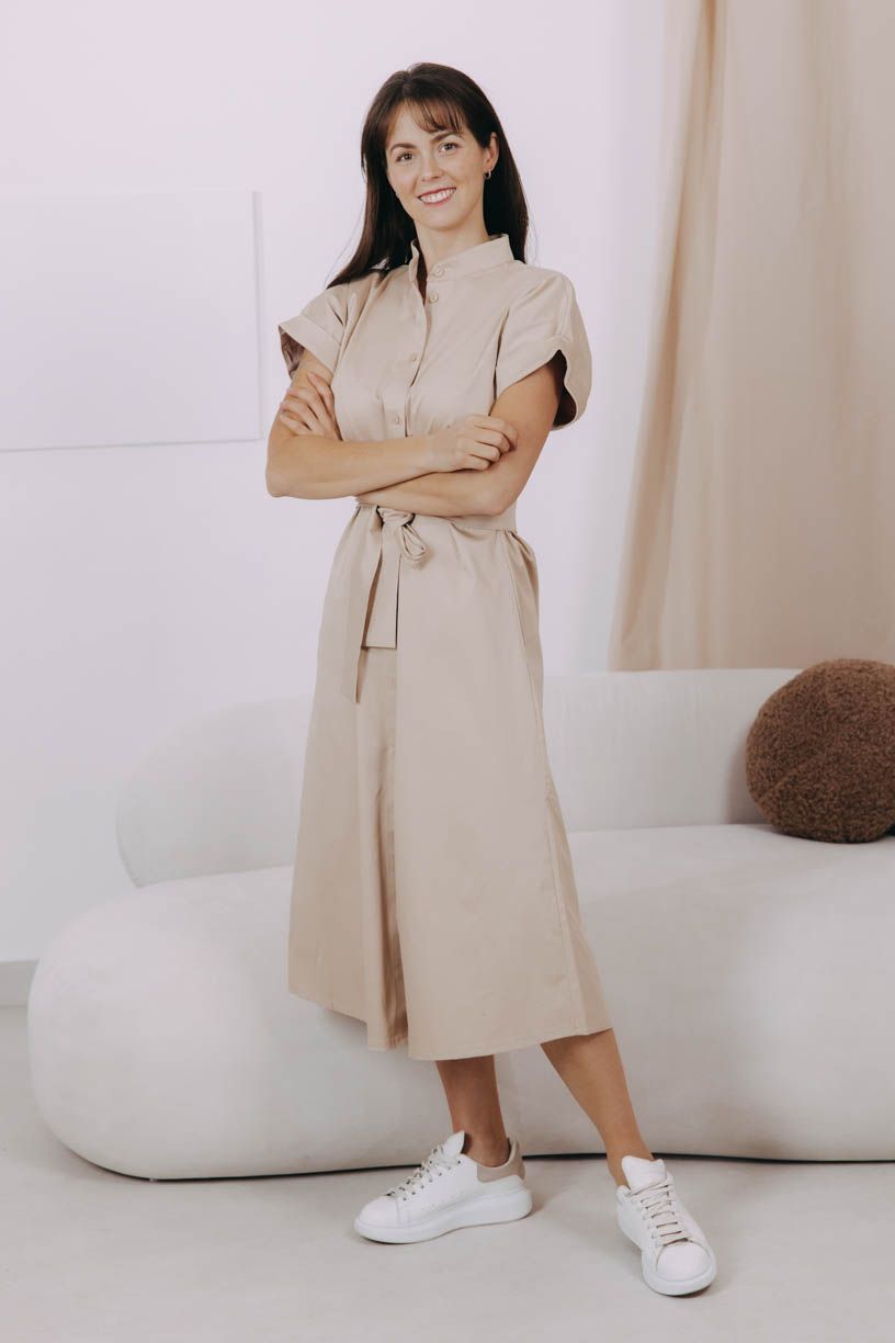 Shania majú decentný golier, s ktorým sa môžete pohrať podľa aktuálnej nálady, rovnako ako s gombíkmi vo farbe látky. Do balíčka prikladáme aj opasok, ktorým môžete krásne podčiarknuť svoju siluetu, a ktorý sa navyše krásne dopĺňa s vyhrnutými rukávmi.