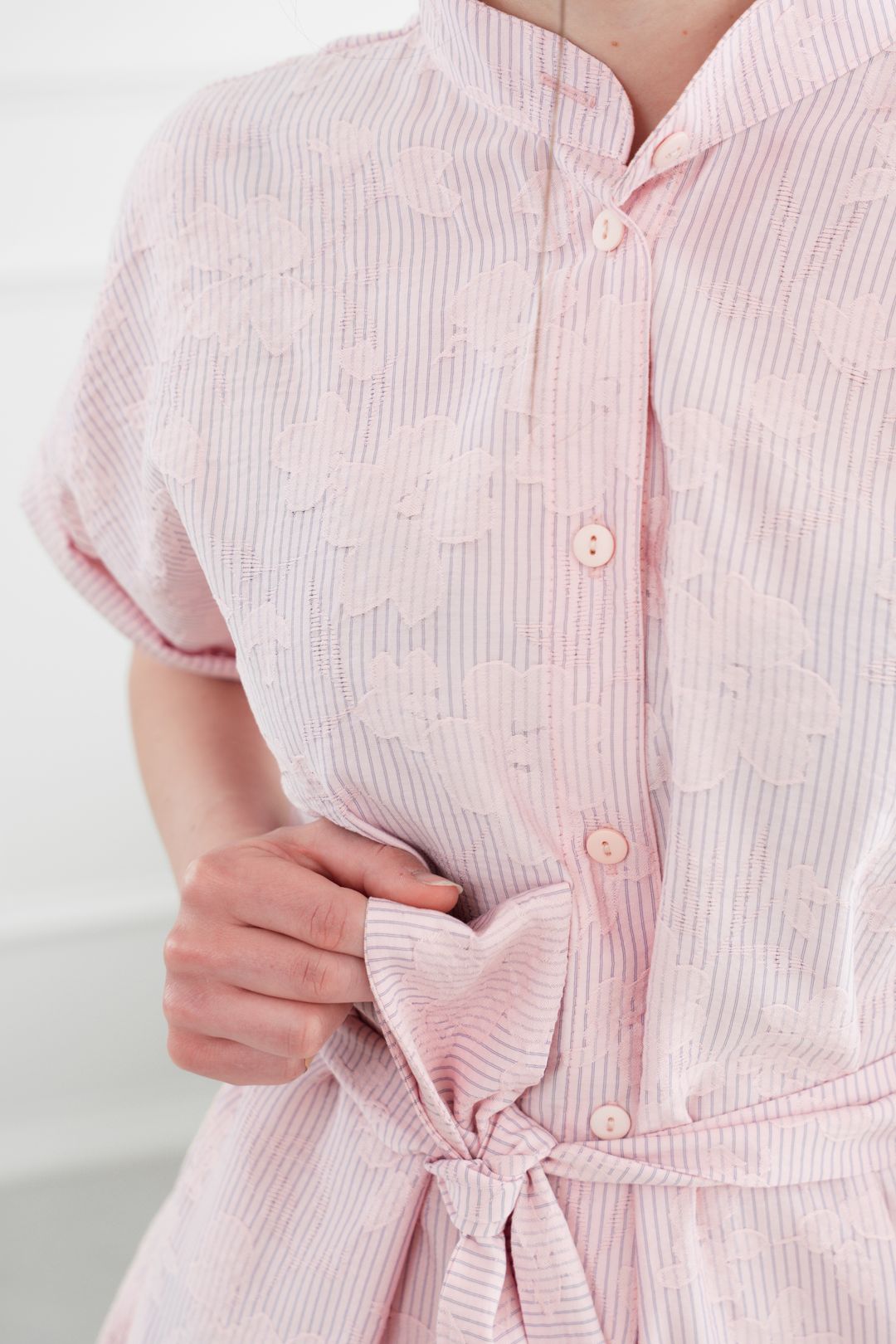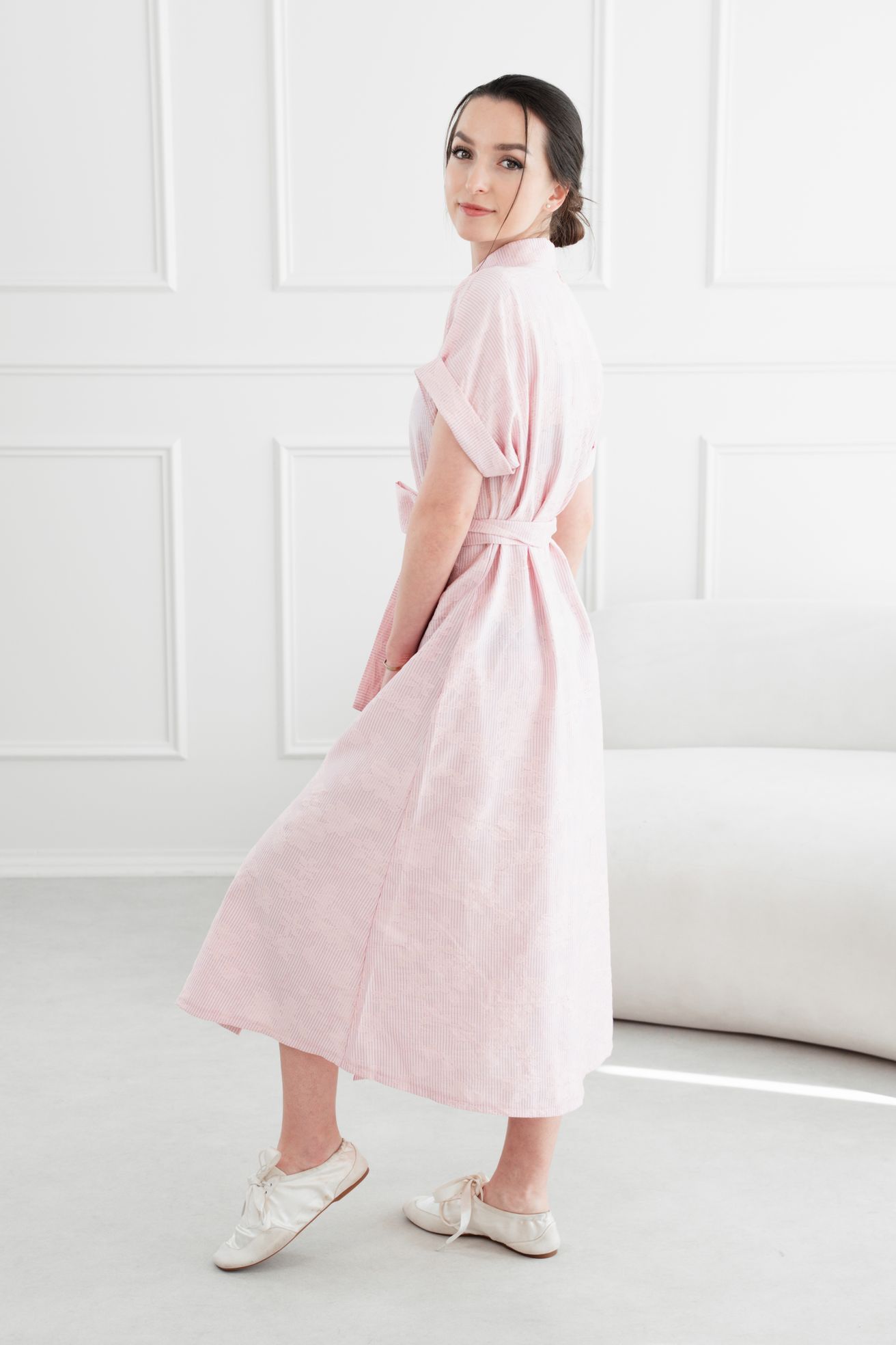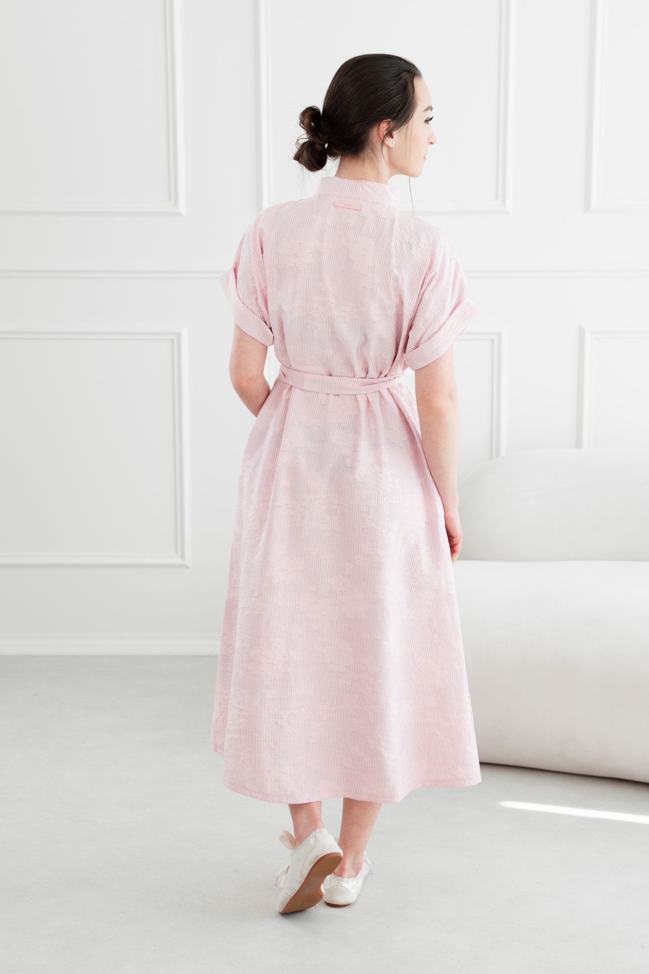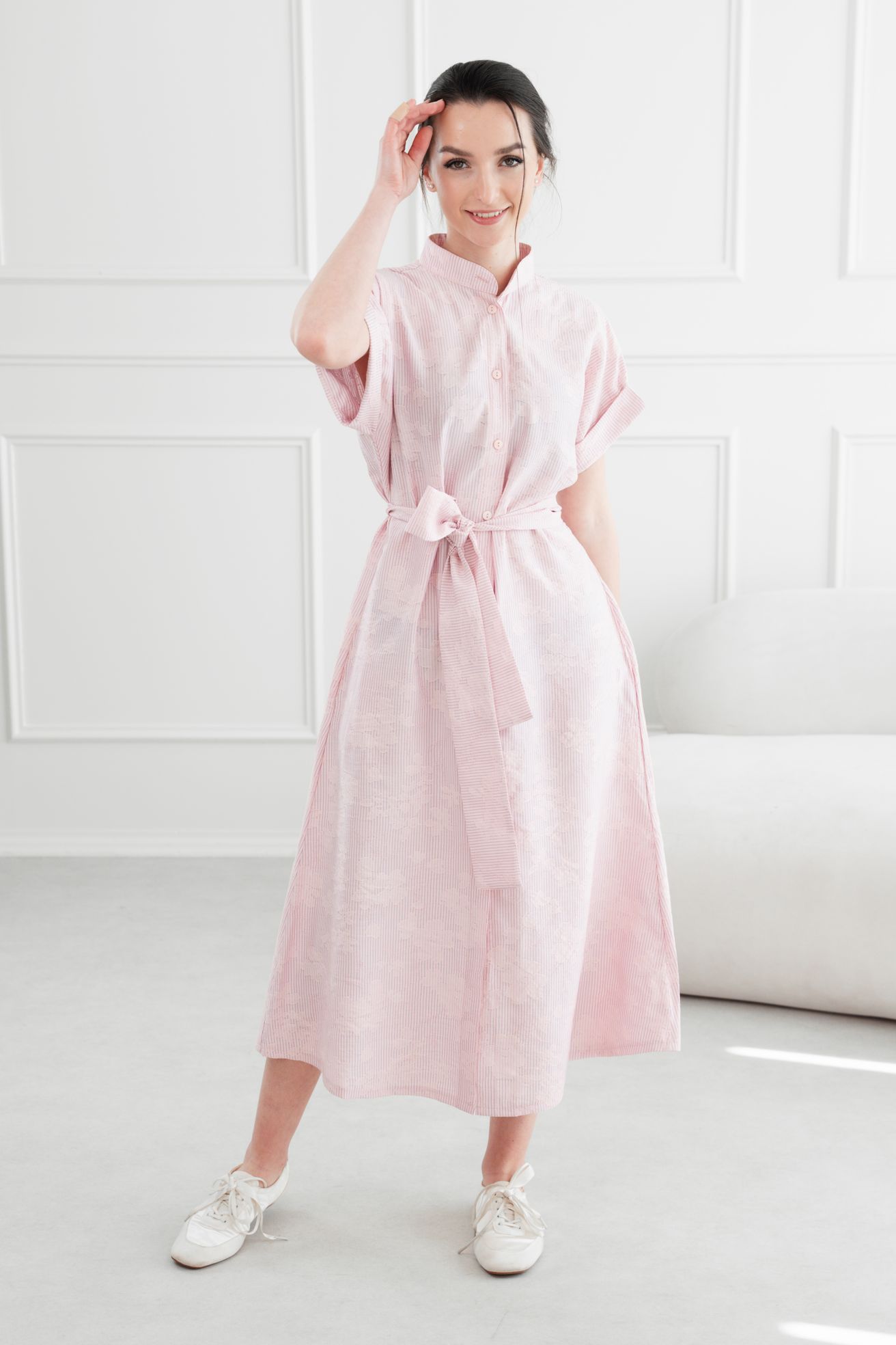 • Rukávy: Ich vyhrnuté konce dodávajú šatám jemne ležérny nádych.