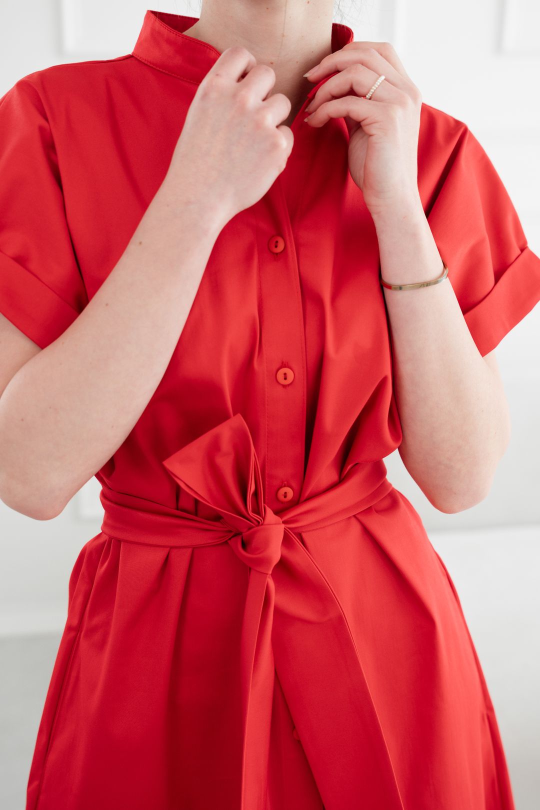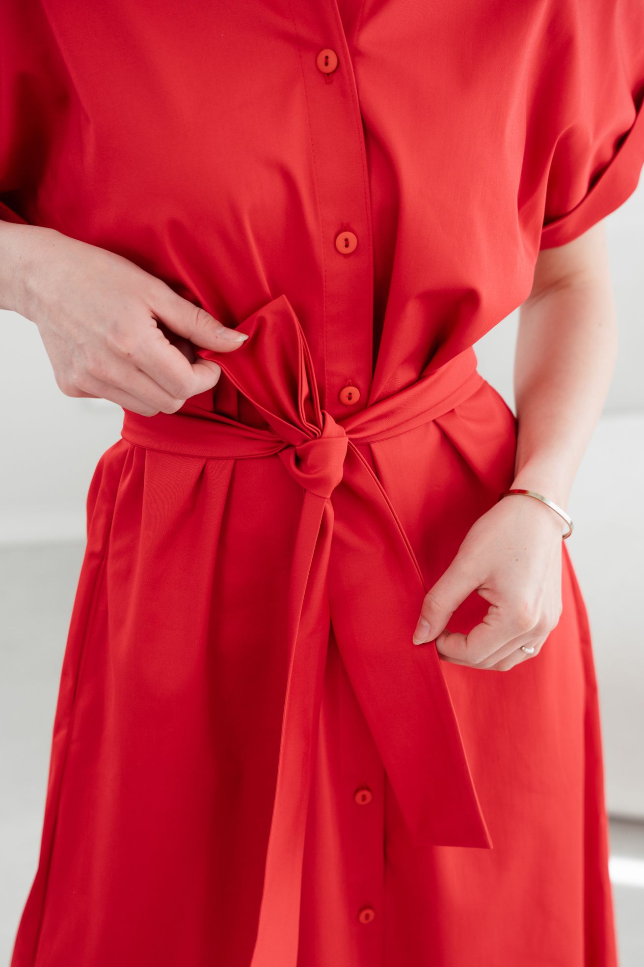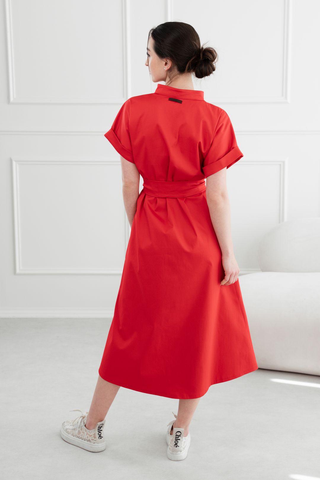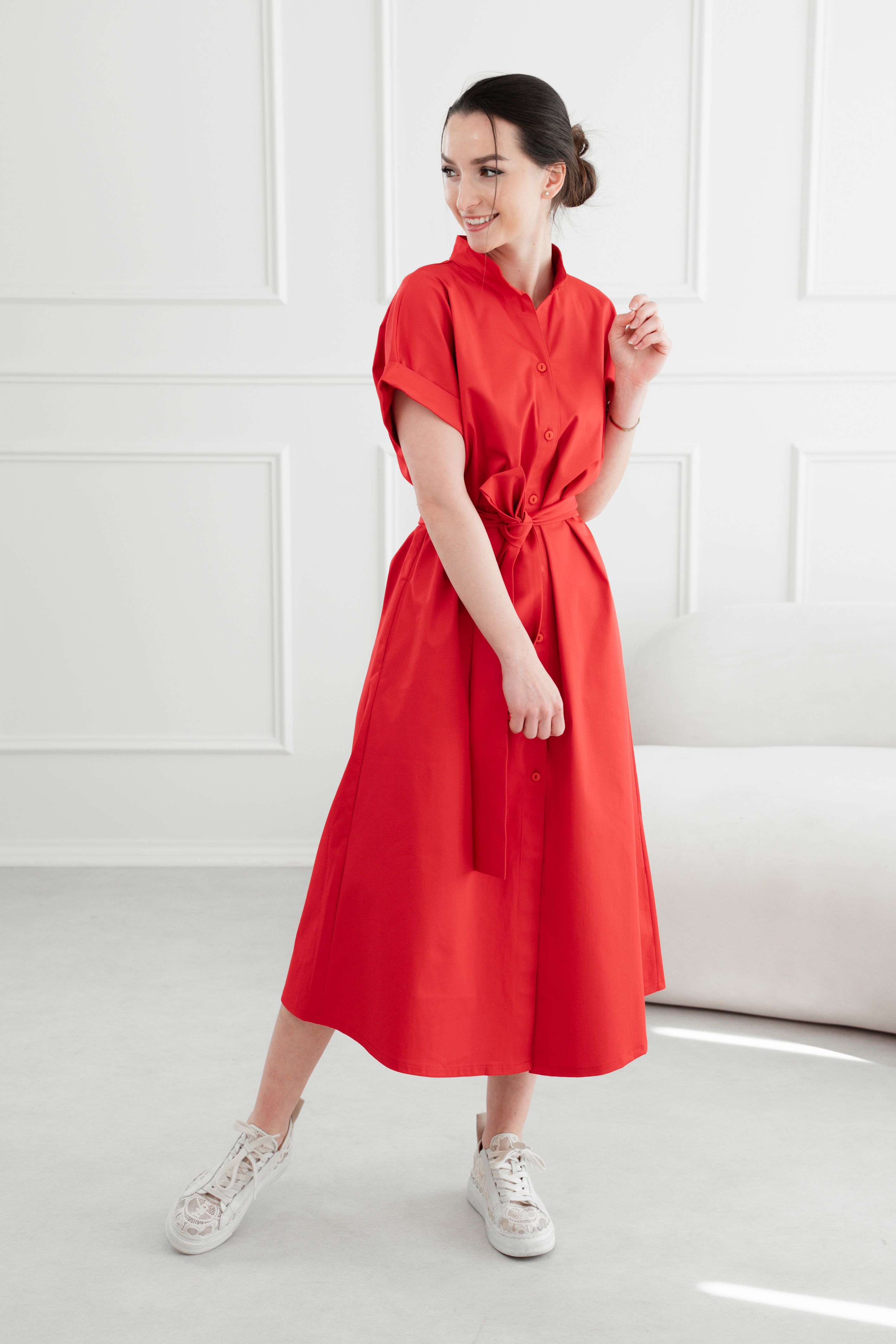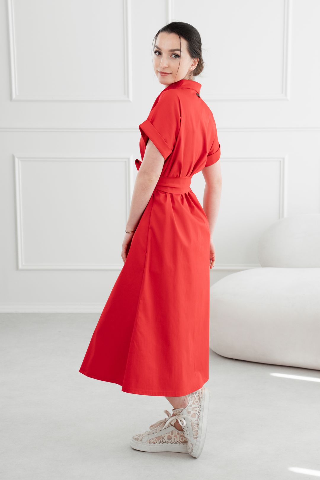 • Rukávy: Ich vyhrnuté konce dodávajú šatám jemne ležérny nádych.