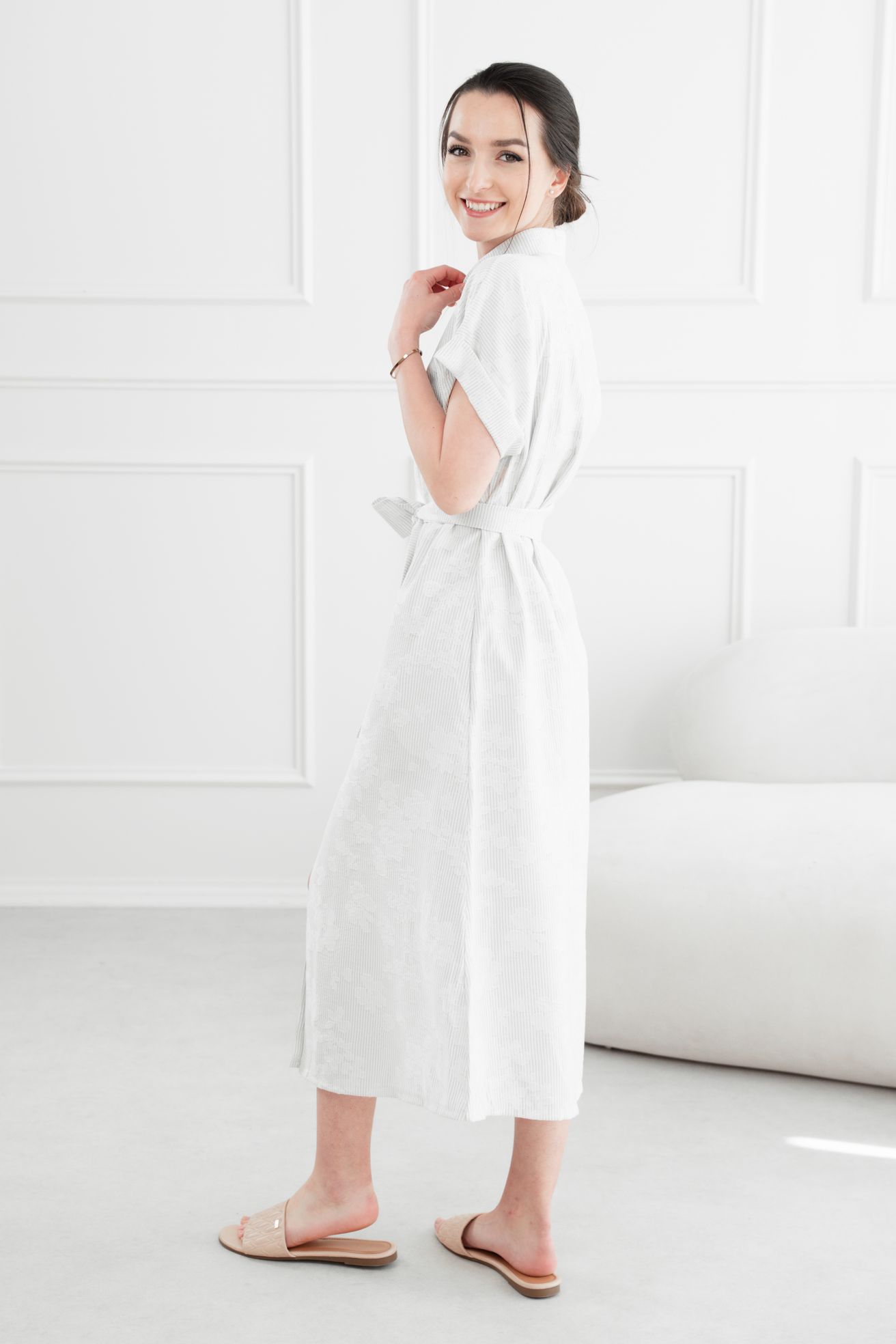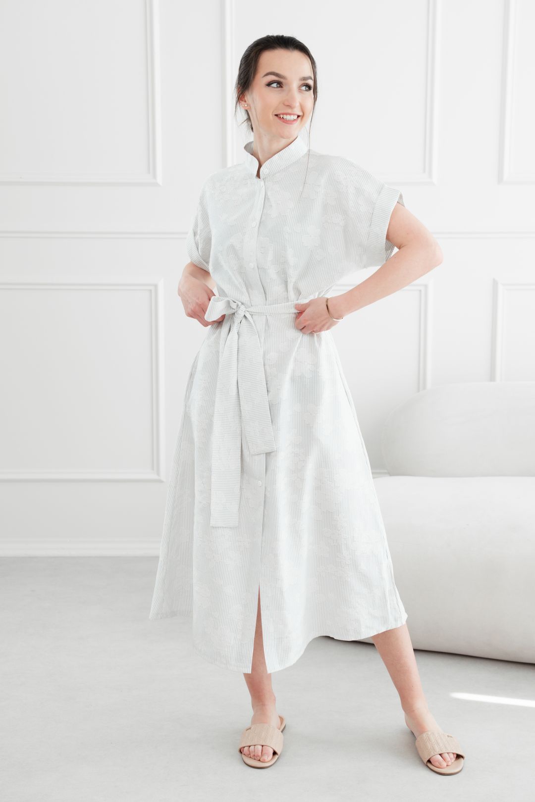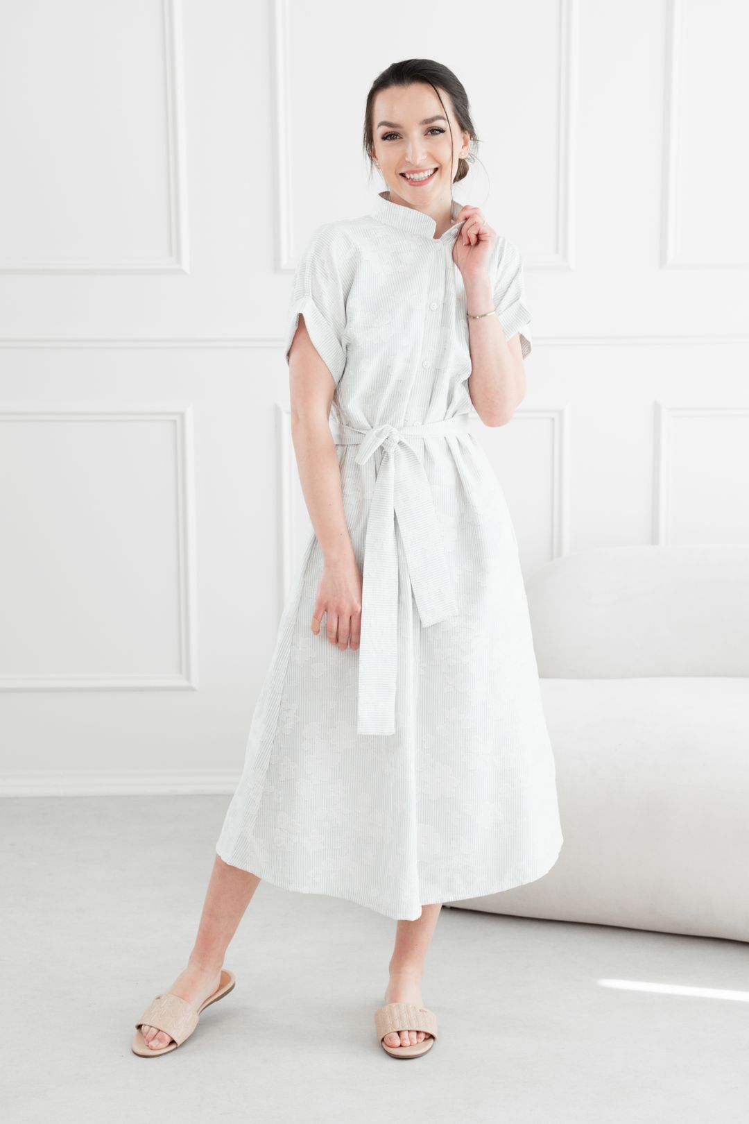 • Rukávy: Ich vyhrnuté konce dodávajú šatám jemne ležérny nádych.