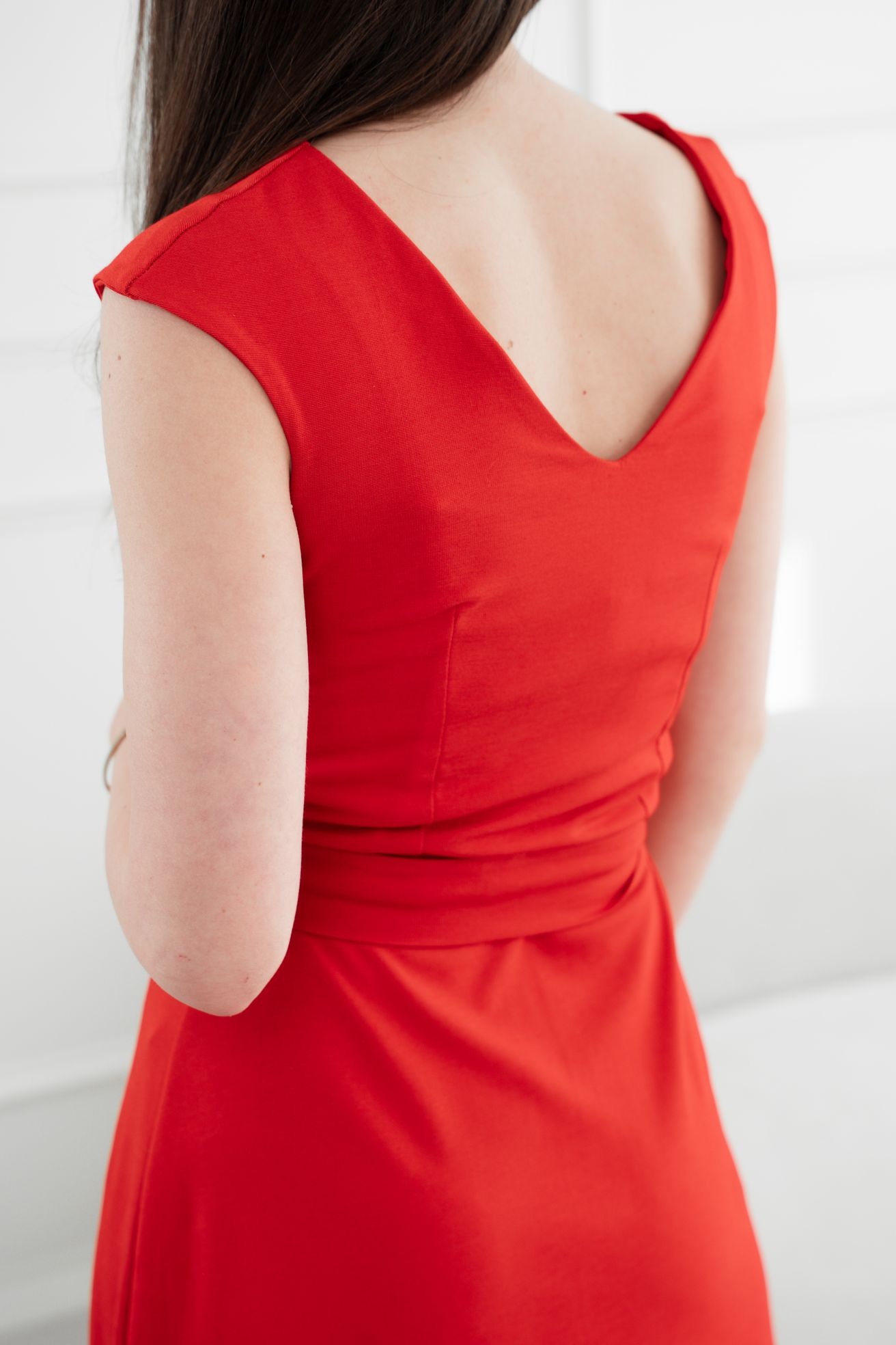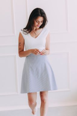 - Strih: Elegantný vrchný diel pripomína puzdrové šaty s výstrihom do V a širokými ramienkami. Horný diel je ušitý z dvojitej látky, aby vám zaistil perfektnú oporu pŕs a vytvaroval dekolt aj bez zložitých kostíc. Jemné záševky krásne tvarujú postavu a ľahká áčková sukňa nad kolená dodá na ženskosti.