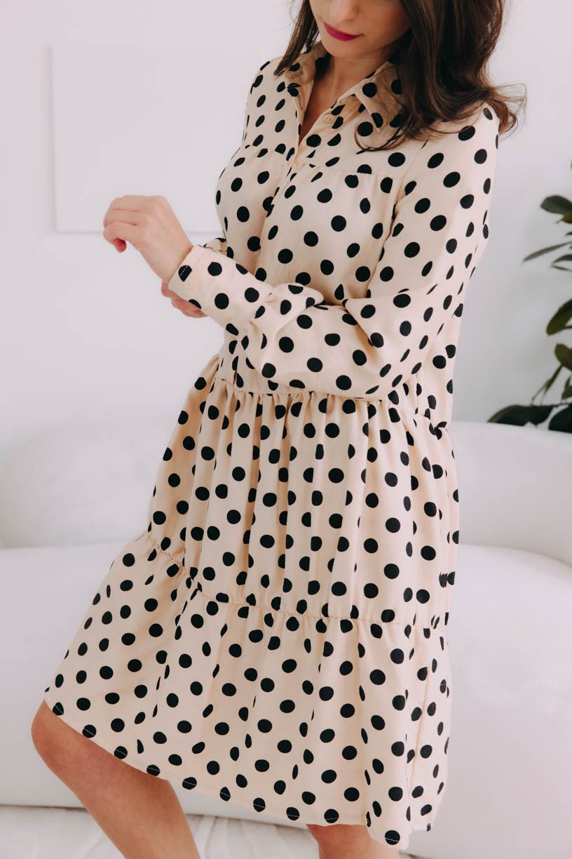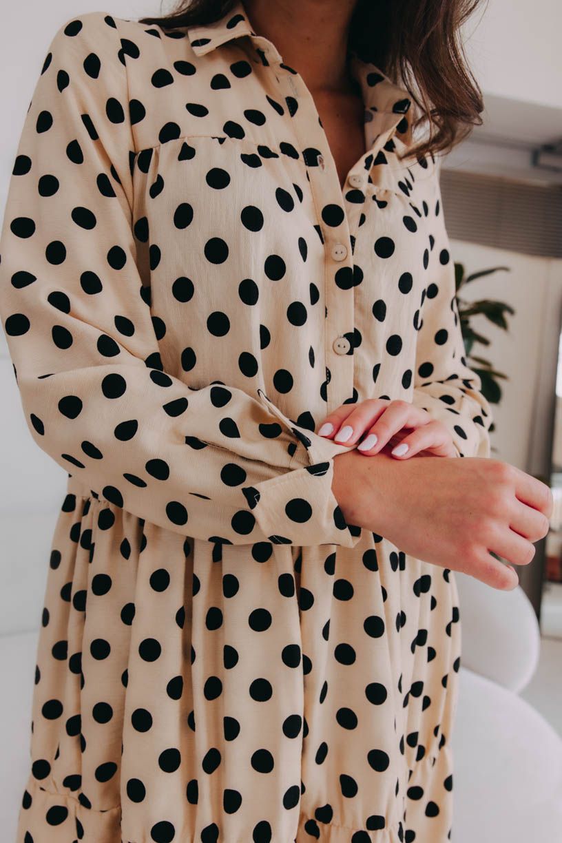 Vrchnú časť zdobí rad jemných gombíkov, ktoré šatám dodávajú sofistikovaný vzhľad, a zároveň sú praktickým riešením pre dojčiace mamičky. Ale to nie je všetko – voľná sukňa, ktorá je v polovici prešitá, vytvára očarujúci vlnitý efekt, pôsobí ľahko a vzdušne. Tieto vlnky budú sprevádzať každý váš krok a dodajú vám pocit voľnosti a ženskosti.