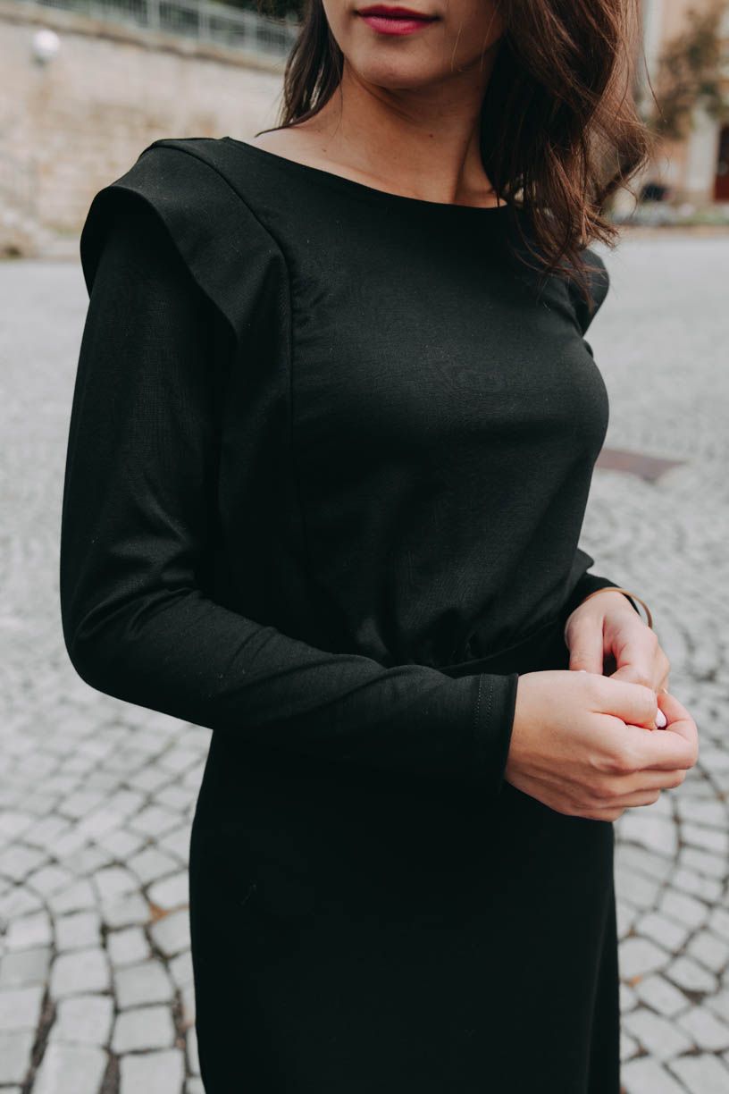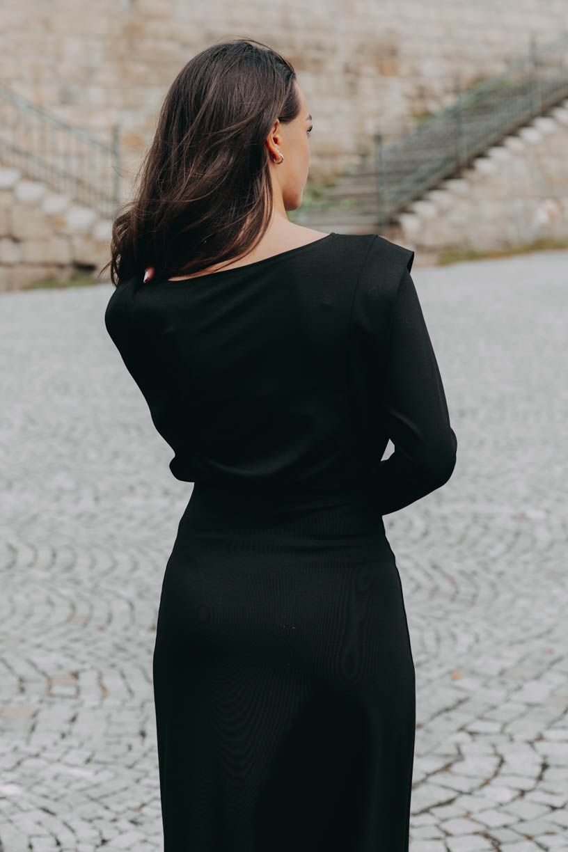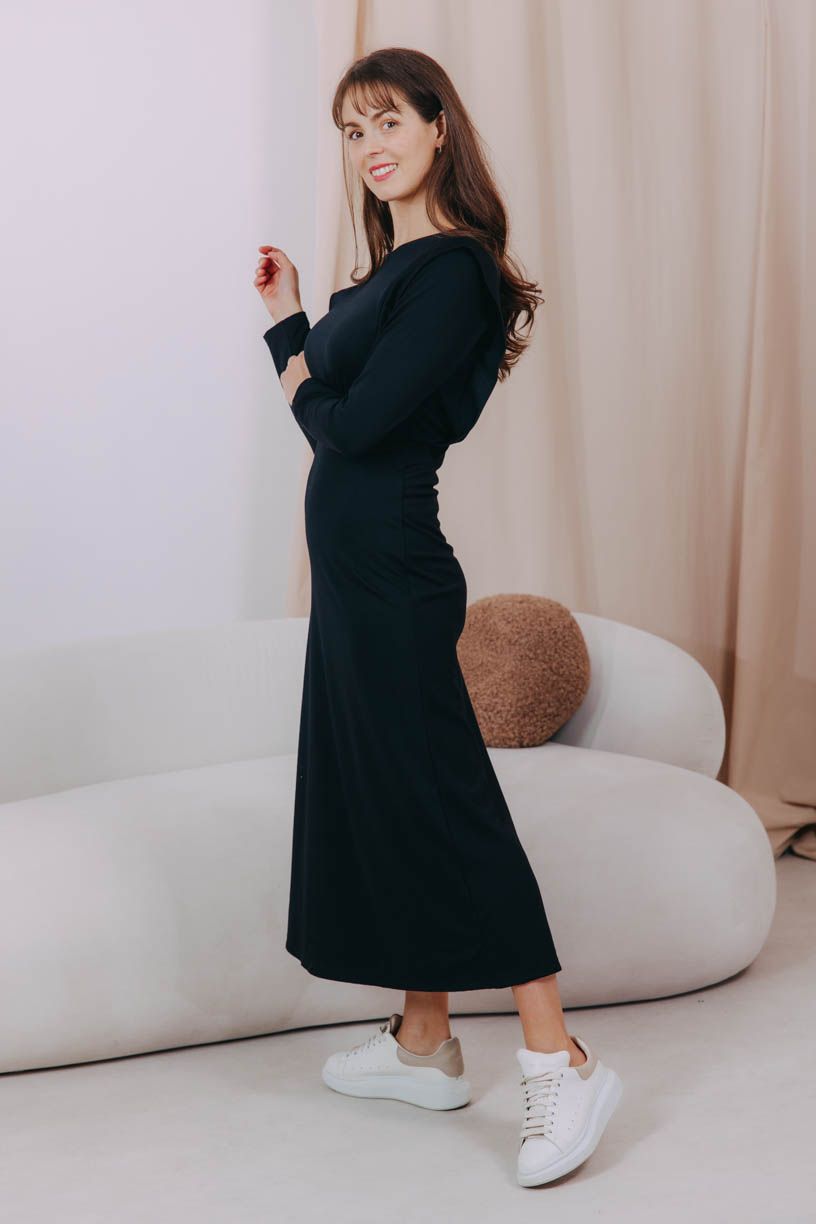 Čierne midi šaty Tyrel s dlhým rukávom a decentnými klopmi na ramenách perfektne tvarujú postavu a dokonale sa kombinujú. Ideálny jesenný kúsok.