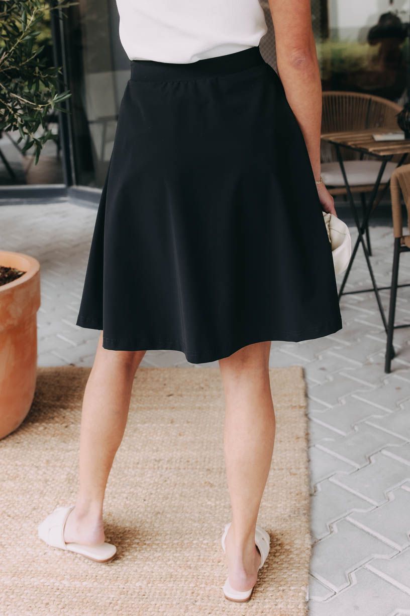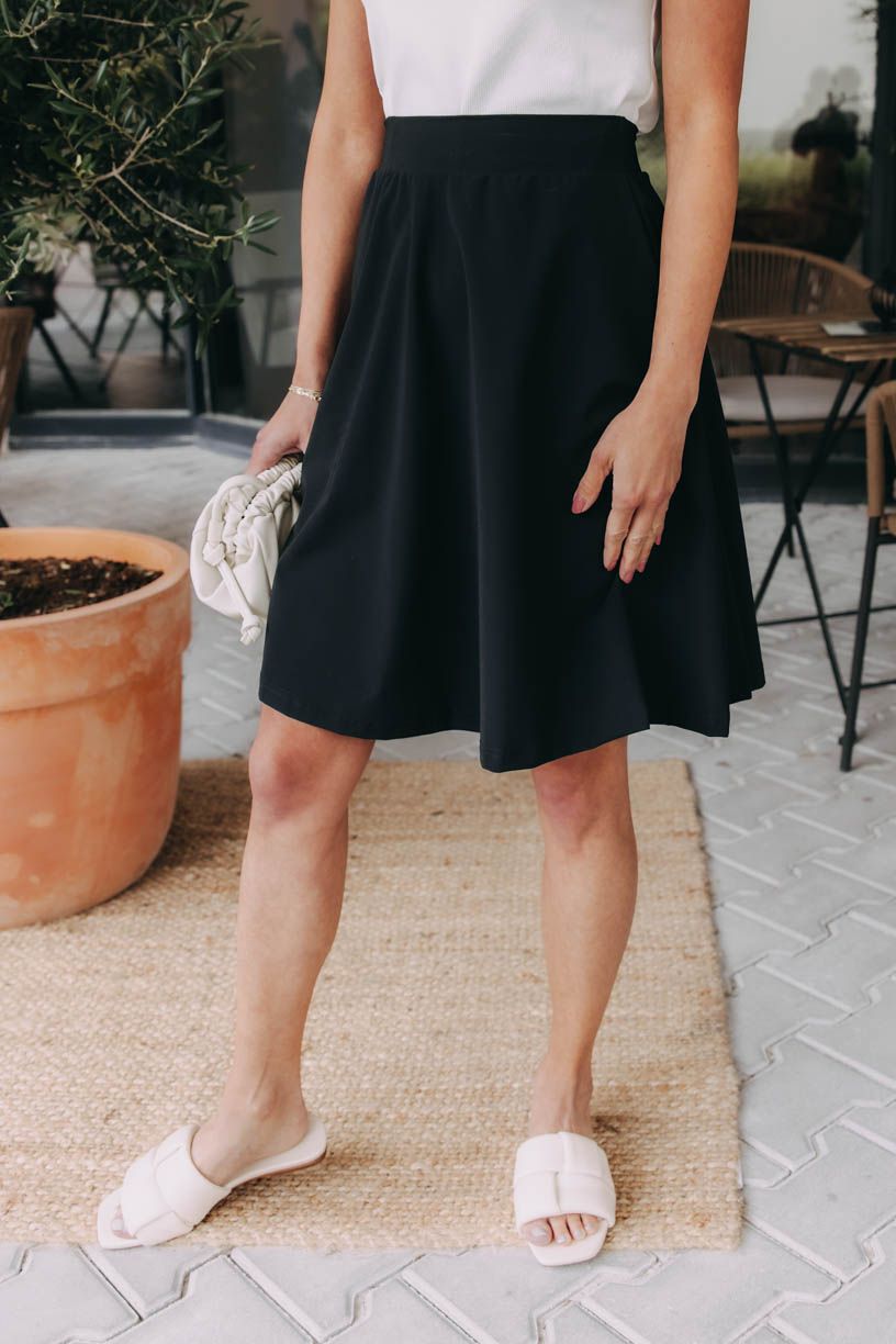 Krátka sukňa Binju v čiernej, to je radosť kombinovať. Áčkový strih, pohodlná guma v páse a príjemný materiál z nej robia základ každého letného outfitu.