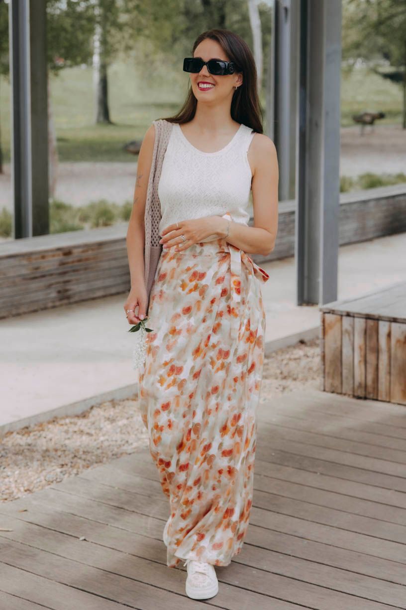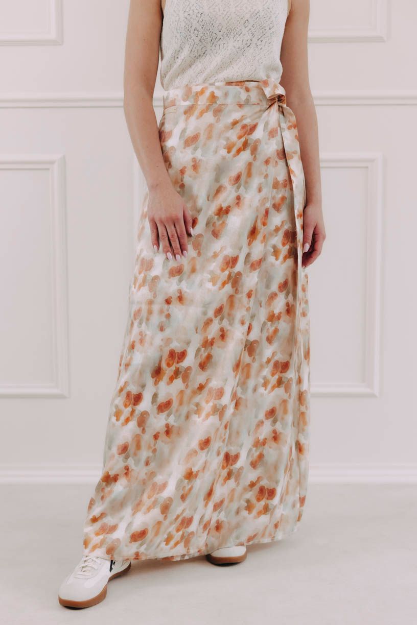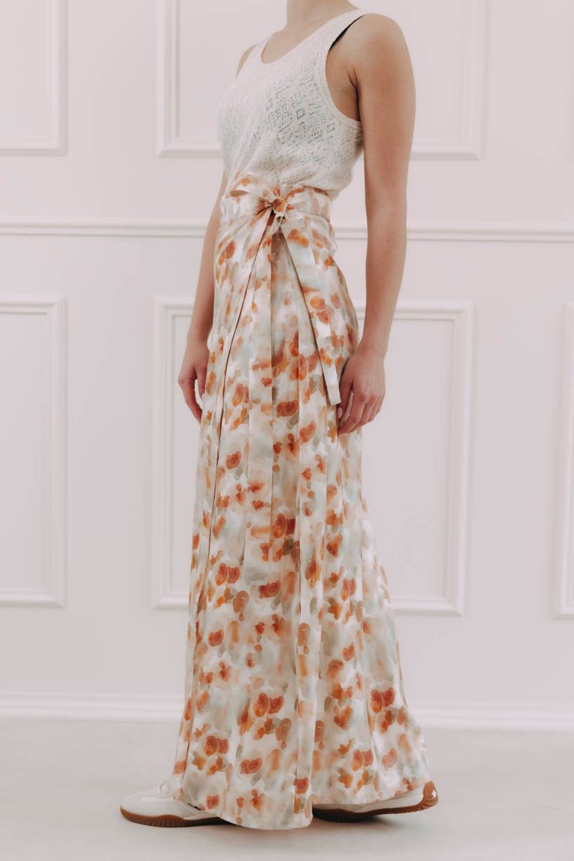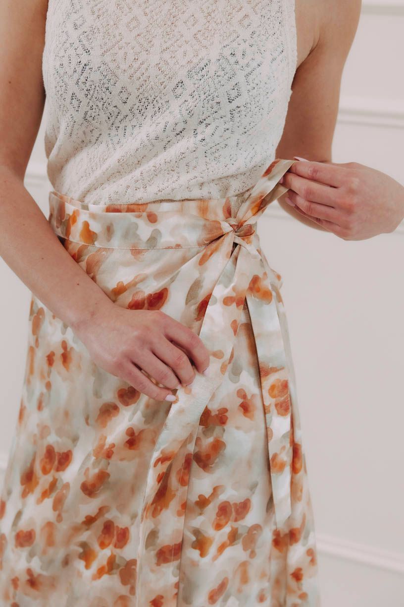 Zavinovacia maxi sukňa Eniola má jednoduchý rovný strih a prirodzenú ľahkosť, ktorú si všimnete hneď pri prvom kroku. Zaväzovanie je praktické aj estetické: na bokoch sú našité dve širšie šnúrky, jedna sa prevlečie cez nenápadný otvor a obopne pás, druhá ju doplní do pevnej a efektnej mašle. Riešenie bez zipsov a háčikov vám dovolí určiť si, kde má sukňa sedieť – vyššie v páse, alebo nižšie, s ležérnejším efektom.