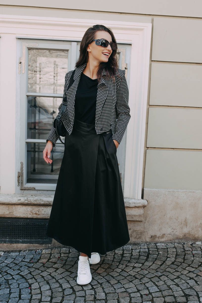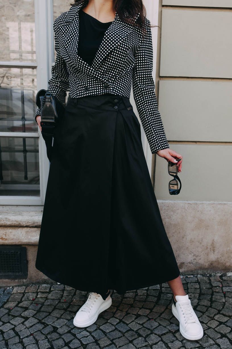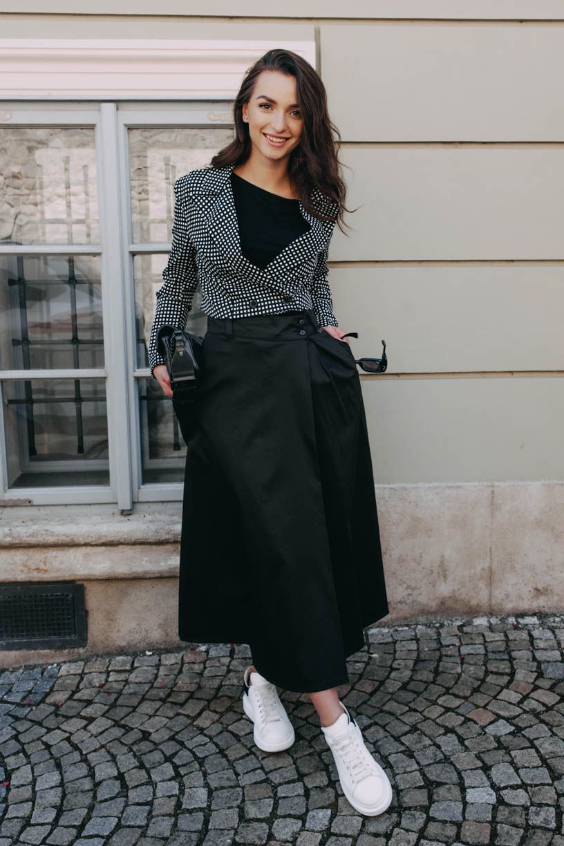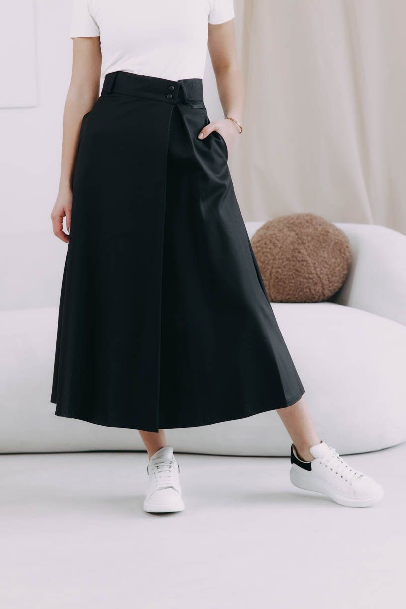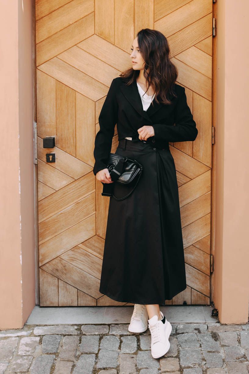 Luo sa zapína na gombíky a pridali sme jej pútka a pevný opasok. Je dlhšia a nie je tak nariasená ako napríklad sukňa Mawe. Skvele ju doplní crop top a krátke sako, ale skombinovať ju môžete napríklad s halter topom, obopnutým rolákom alebo oversized svetrom. Elegancia bude hrať prím v každom outfite, ktorý so zavinovačkou Luo poskladáte.