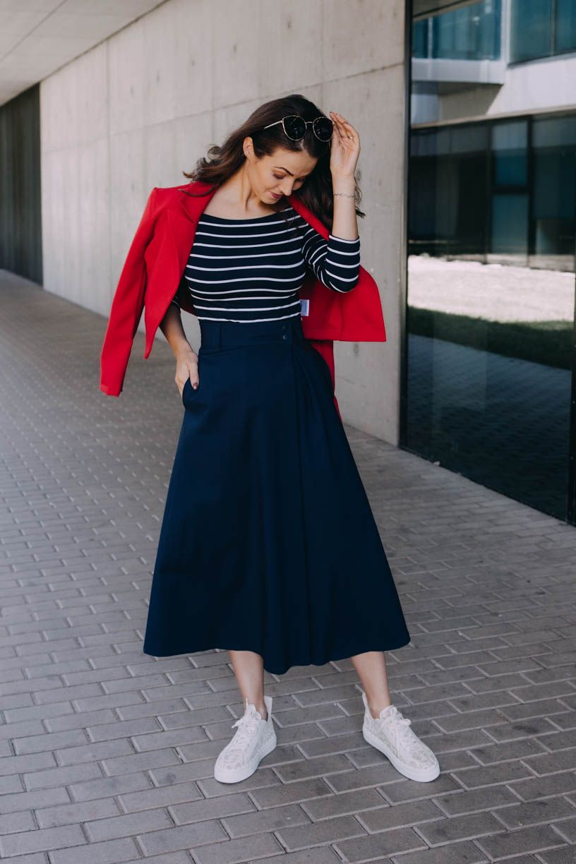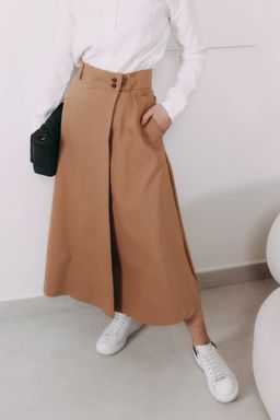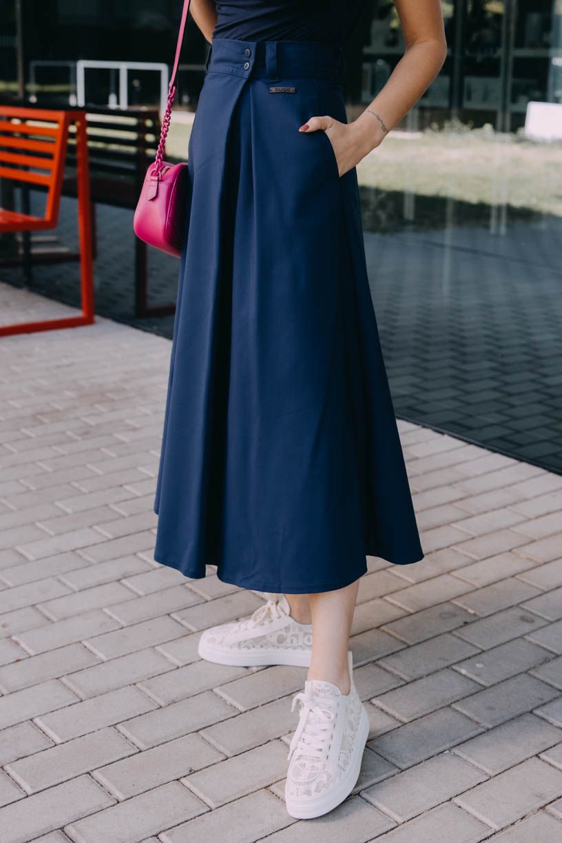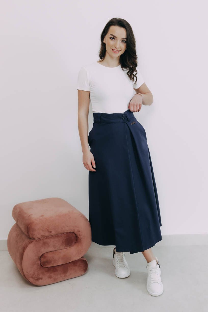 Luo sa zapína na gombíky a pridali sme jej pútka a pevný opasok. Je dlhšia a nie je tak nariasená ako napríklad sukňa Mawe. Skvele ju doplní crop top a krátke sako, ale skombinovať ju môžete napríklad s halter topom, obopnutým rolákom alebo oversized svetrom. Elegancia bude hrať prím v každom outfite, ktorý so zavinovačkou Luo poskladáte.