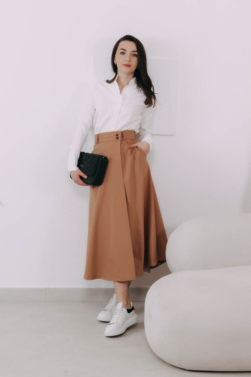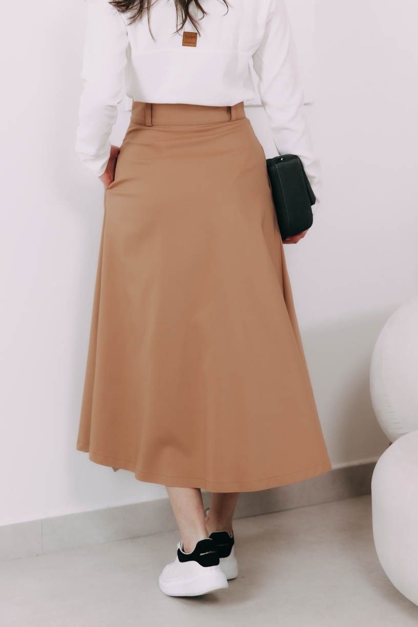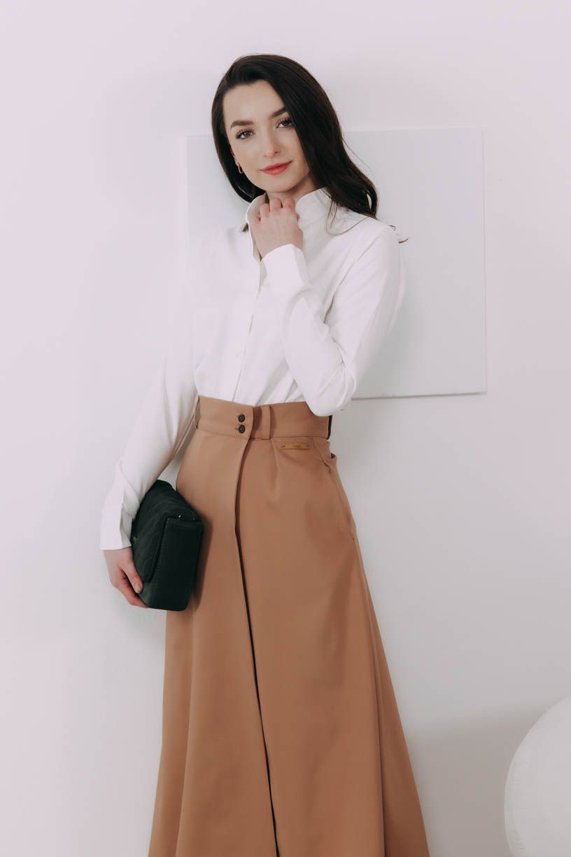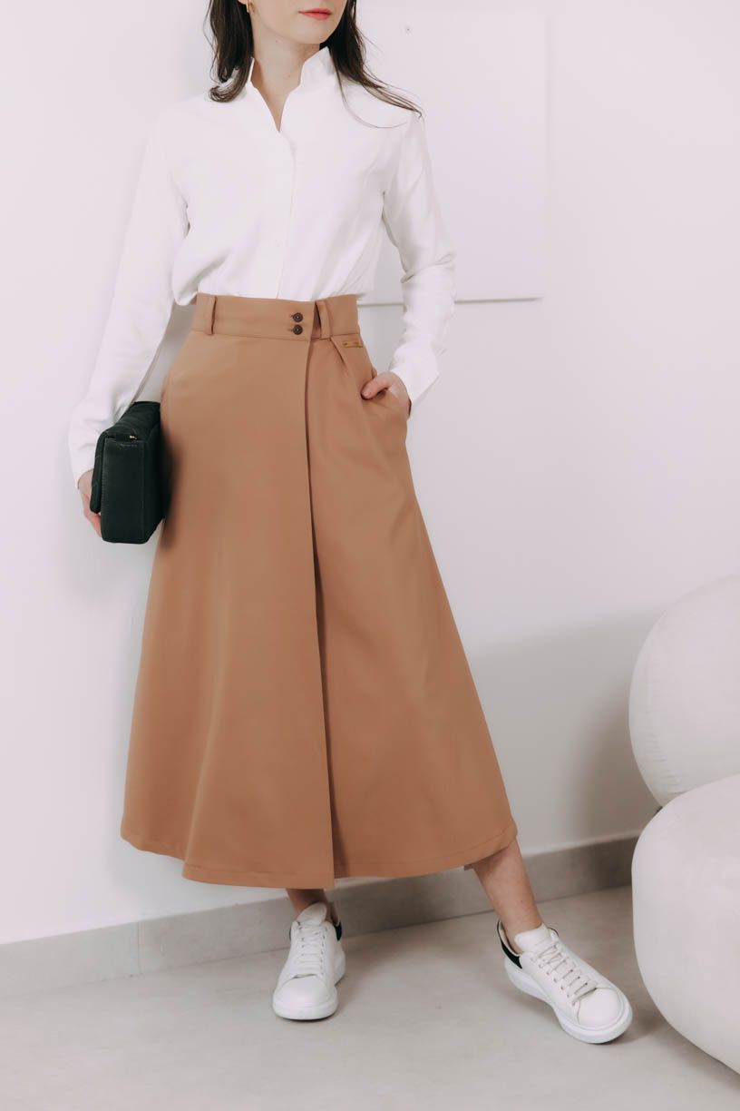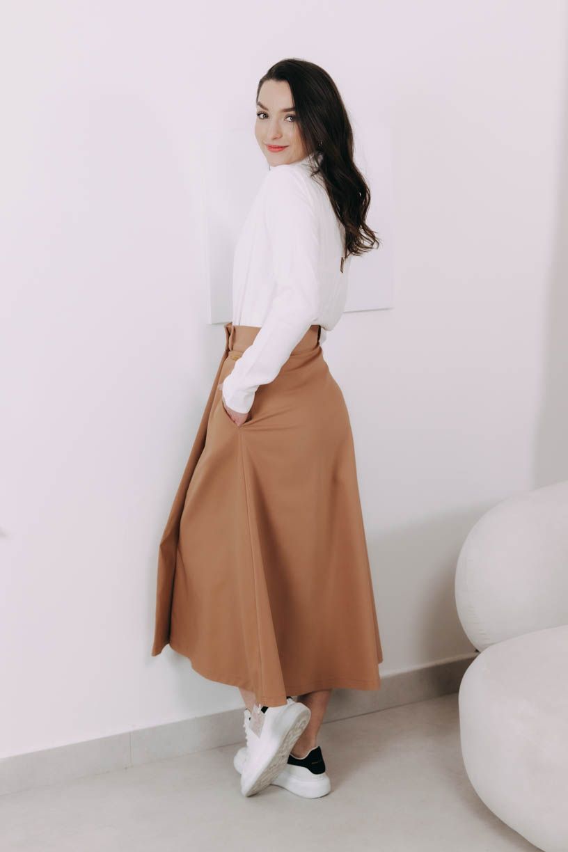 Luo sa zapína na gombíky a pridali sme jej pútka a pevný opasok. Je dlhšia a nie je tak nariasená ako napríklad sukňa Mawe. Skvele ju doplní crop top a krátke sako, ale skombinovať ju môžete napríklad s halter topom, obopnutým rolákom alebo oversized svetrom. Elegancia bude hrať prím v každom outfite, ktorý so zavinovačkou Luo poskladáte.