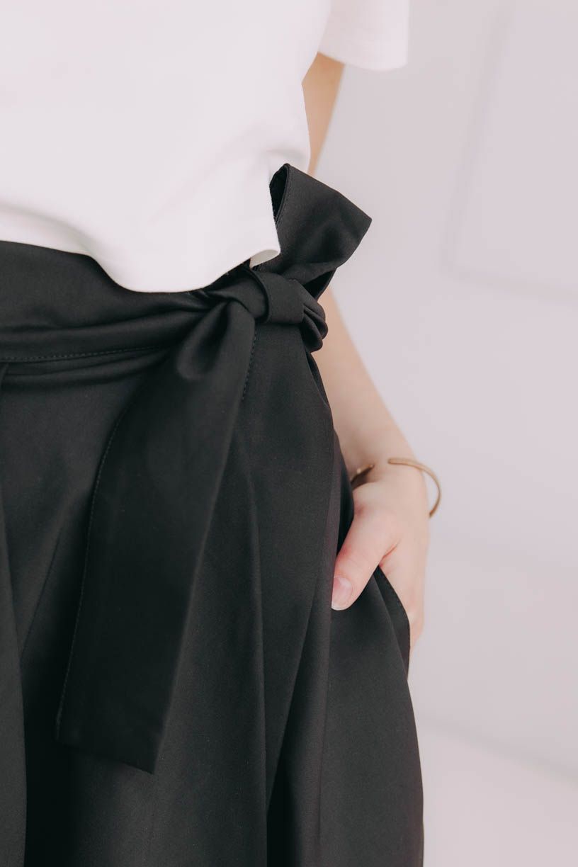 Sukňa sa zapína pomocou štyroch gombíkov a dvoch dierok, čo umožňuje nastavenie pásu presne na mieru a zaisťuje, že krásne drží tam, kde má. Mašľa v páse nie je len na ozdobu, ale slúži aj ako praktická poistka pre maximálne pohodlie a sebavedomie.