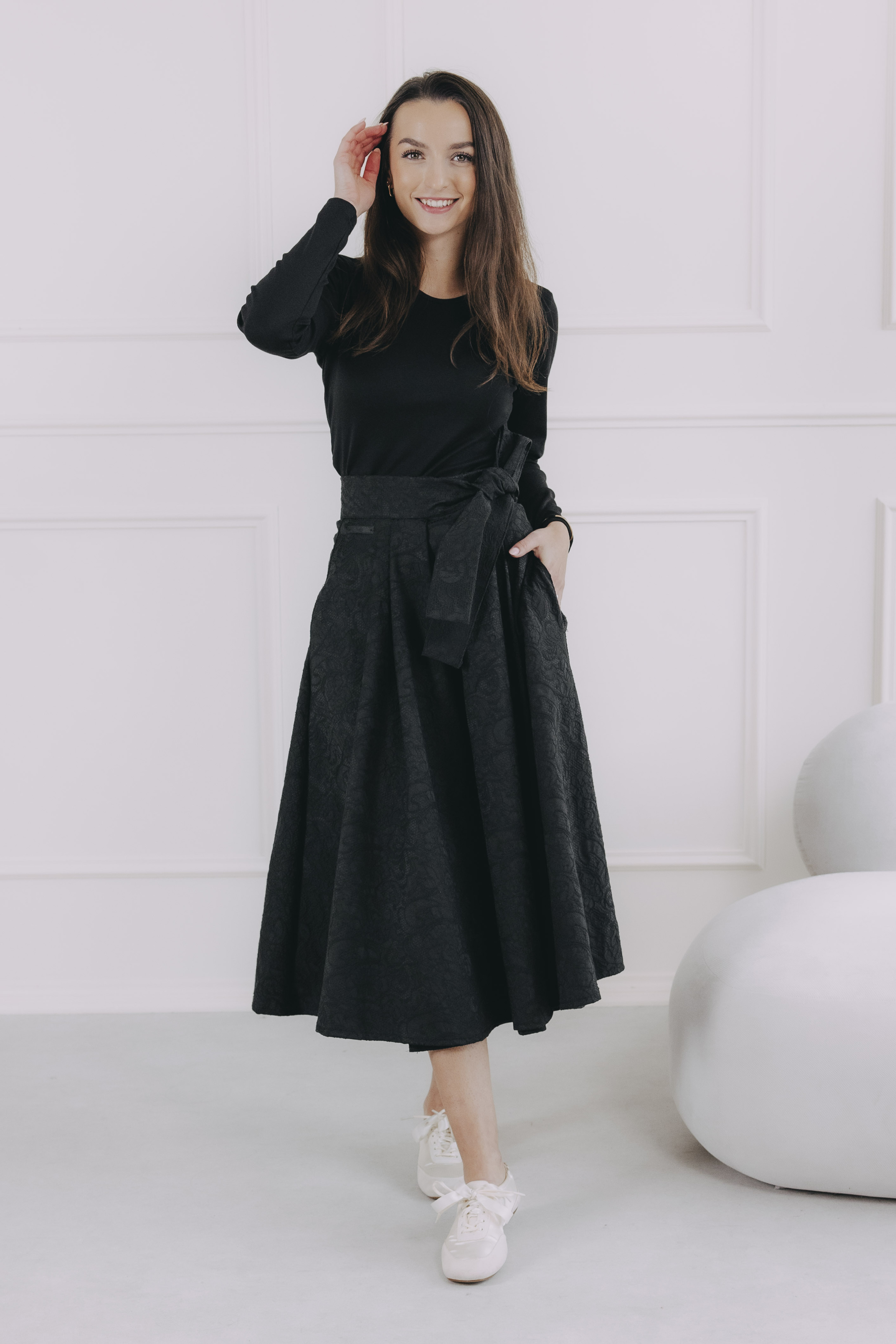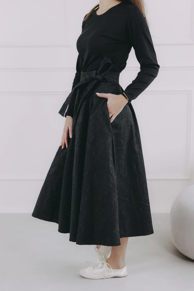 Sukňa sa zapína pomocou štyroch gombíkov a dvoch dierok, čo umožňuje nastavenie pásu presne na mieru a zaisťuje, že krásne drží tam, kde má. Mašľa v páse nie je len na ozdobu, ale slúži aj ako praktická poistka pre maximálne pohodlie a sebavedomie.