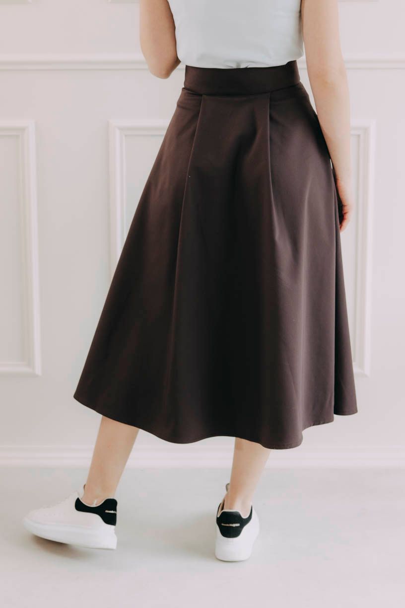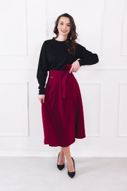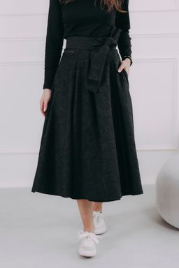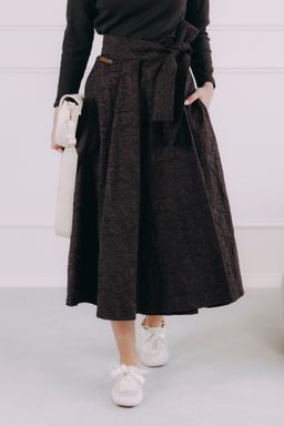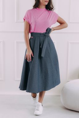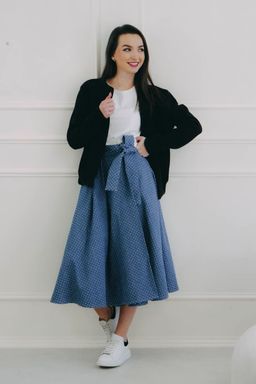 Sukňa sa zapína pomocou štyroch gombíkov a dvoch dierok, čo umožňuje nastavenie pásu presne na mieru a zaisťuje, že krásne drží tam, kde má. Mašľa v páse nie je len na ozdobu, ale slúži aj ako praktická poistka pre maximálne pohodlie a sebavedomie.