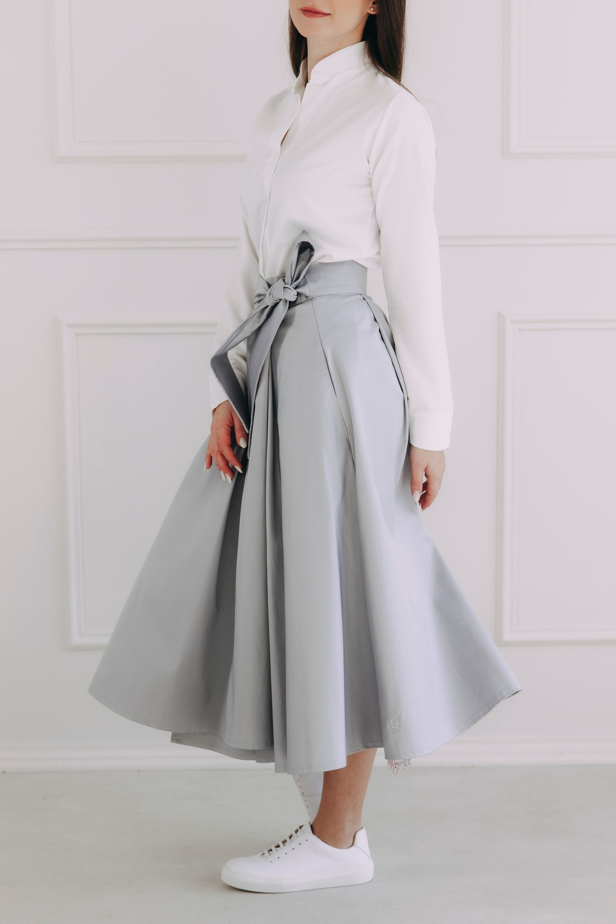 Sukňa sa zapína pomocou štyroch gombíkov a dvoch dierok, čo umožňuje nastavenie pásu presne na mieru a zaisťuje, že krásne drží tam, kde má. Mašľa v páse nie je len na ozdobu, ale slúži aj ako praktická poistka pre maximálne pohodlie a sebavedomie.