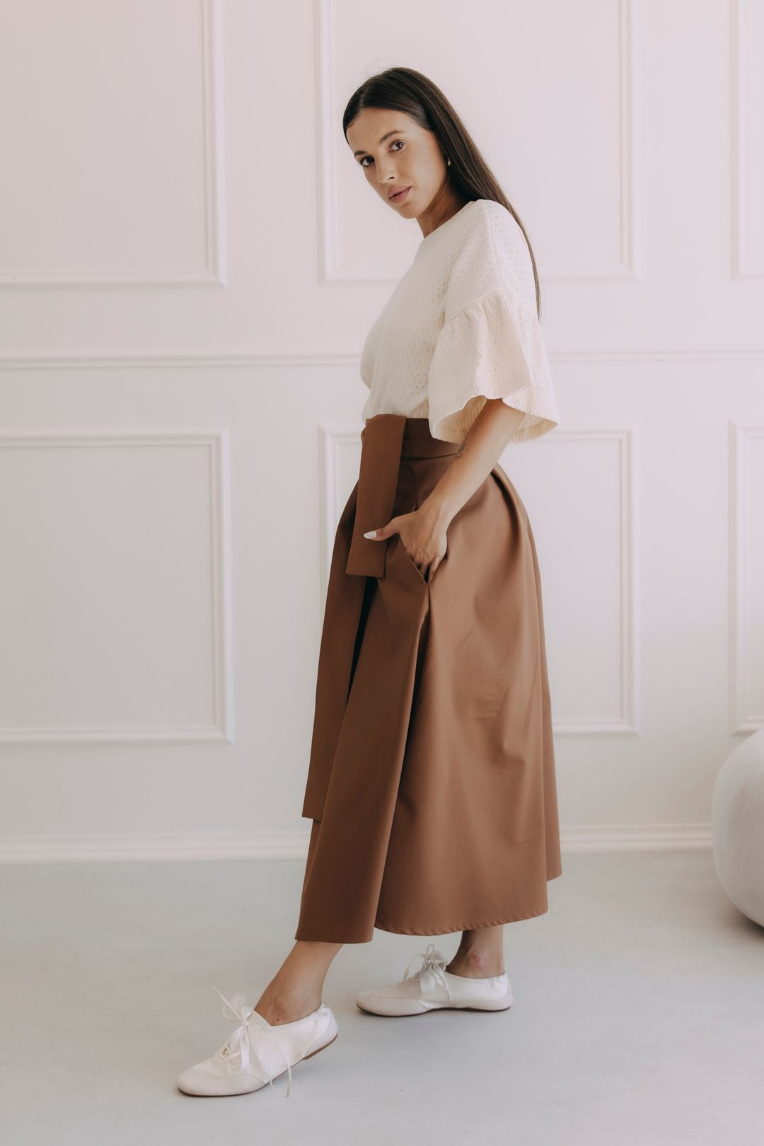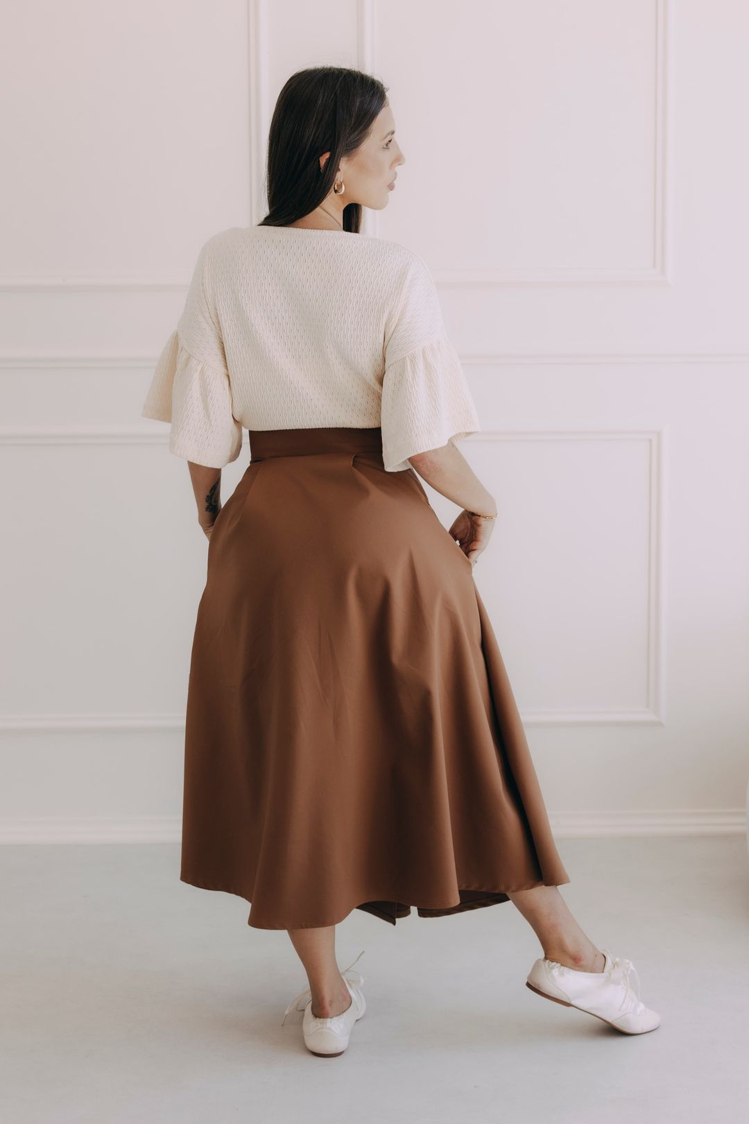 Sukňa sa zapína pomocou štyroch gombíkov a dvoch dierok, čo umožňuje nastavenie pásu presne na mieru a zaisťuje, že krásne drží tam, kde má. Mašľa v páse nie je len na ozdobu, ale slúži aj ako praktická poistka pre maximálne pohodlie a sebavedomie.