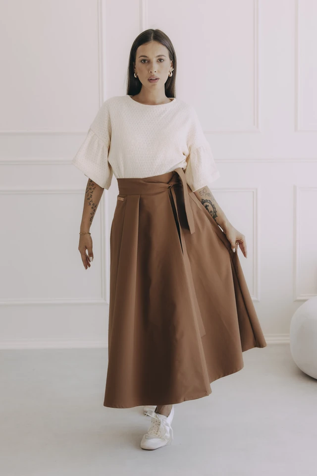 Fantázii sa medze nekladú. Mawe sa ľahko kombinuje s tým, čo už máte v šatníku. V lete ju skombinujte s crop topom, elegantnou košeľou alebo s body. Keď sa ochladí, nebojte sa ju vrstviť - skvele vyzerá s pančuškami, rolákom a koženou bundou. Stuha v páse je dokonalým detailom na uviazanie mašle, ktorá celý outfit posunie na vyššiu úroveň.