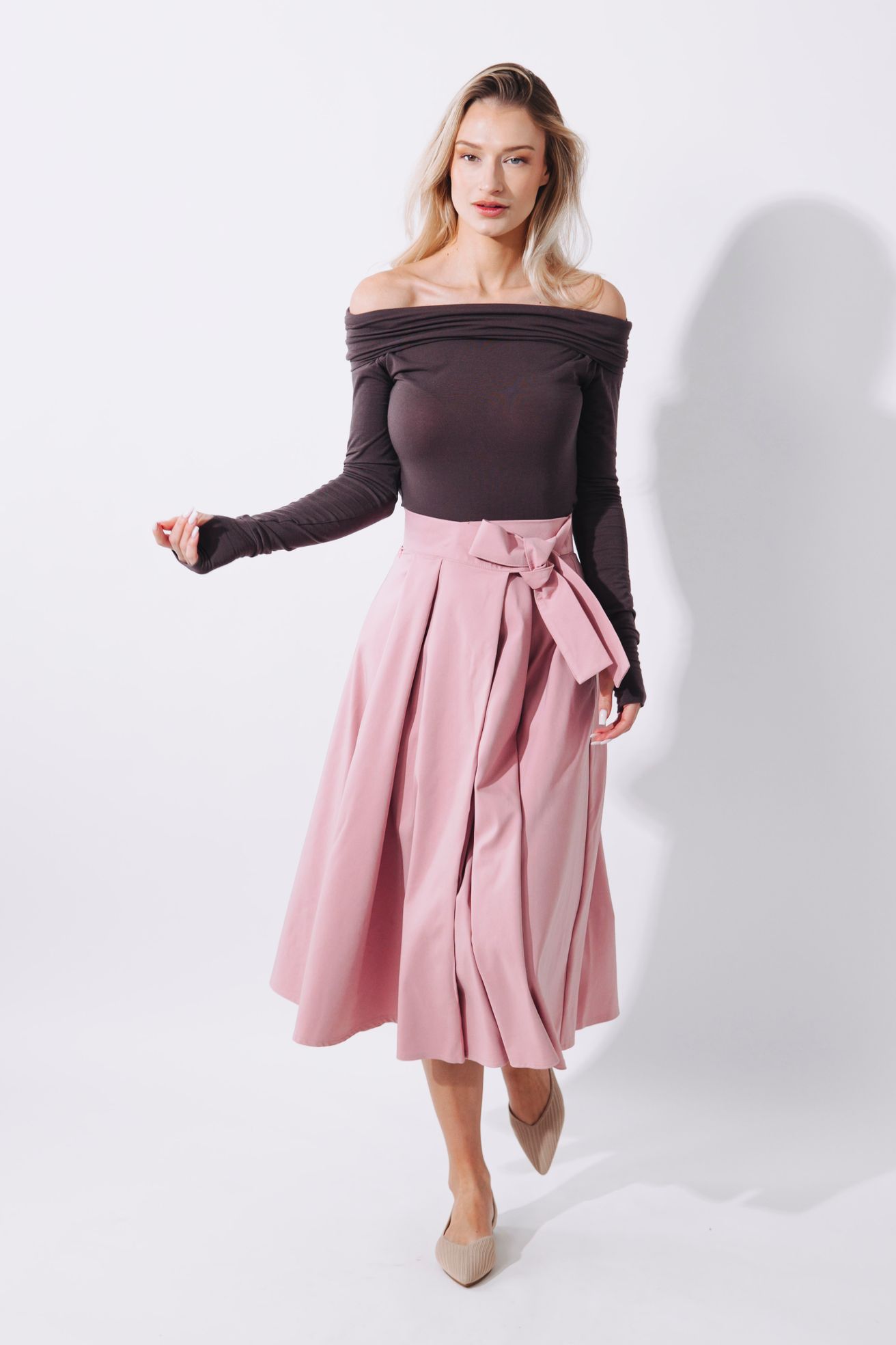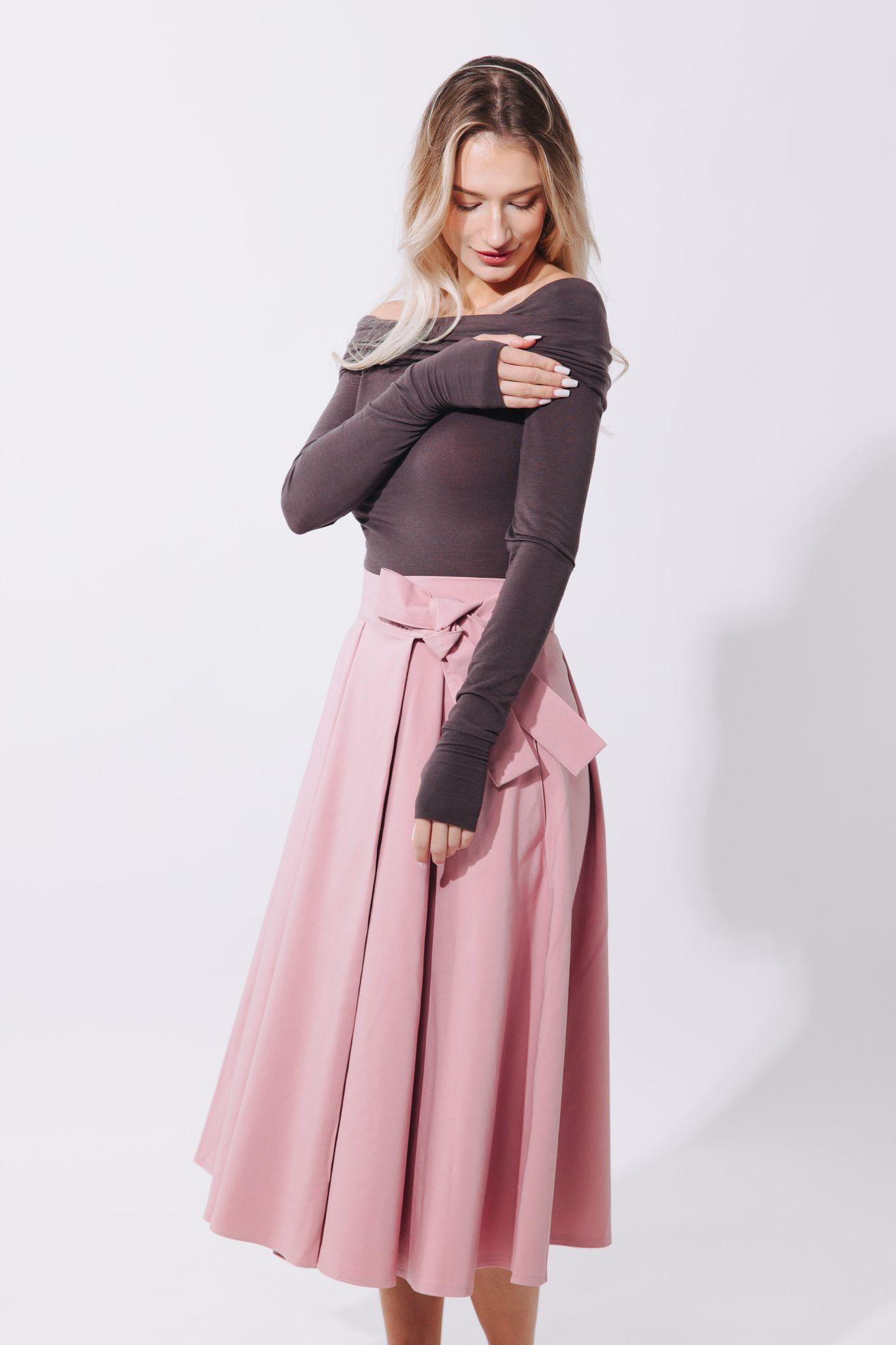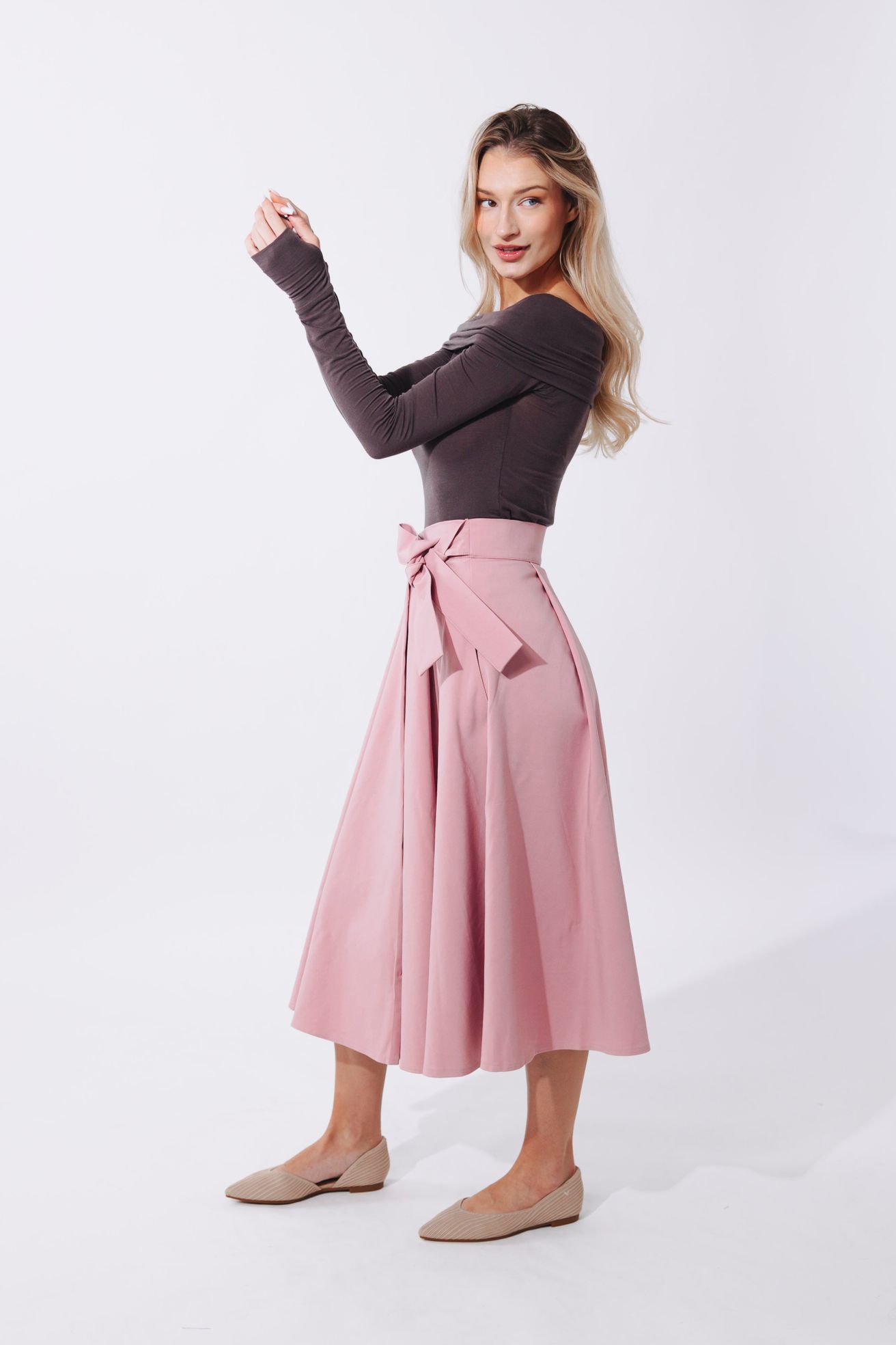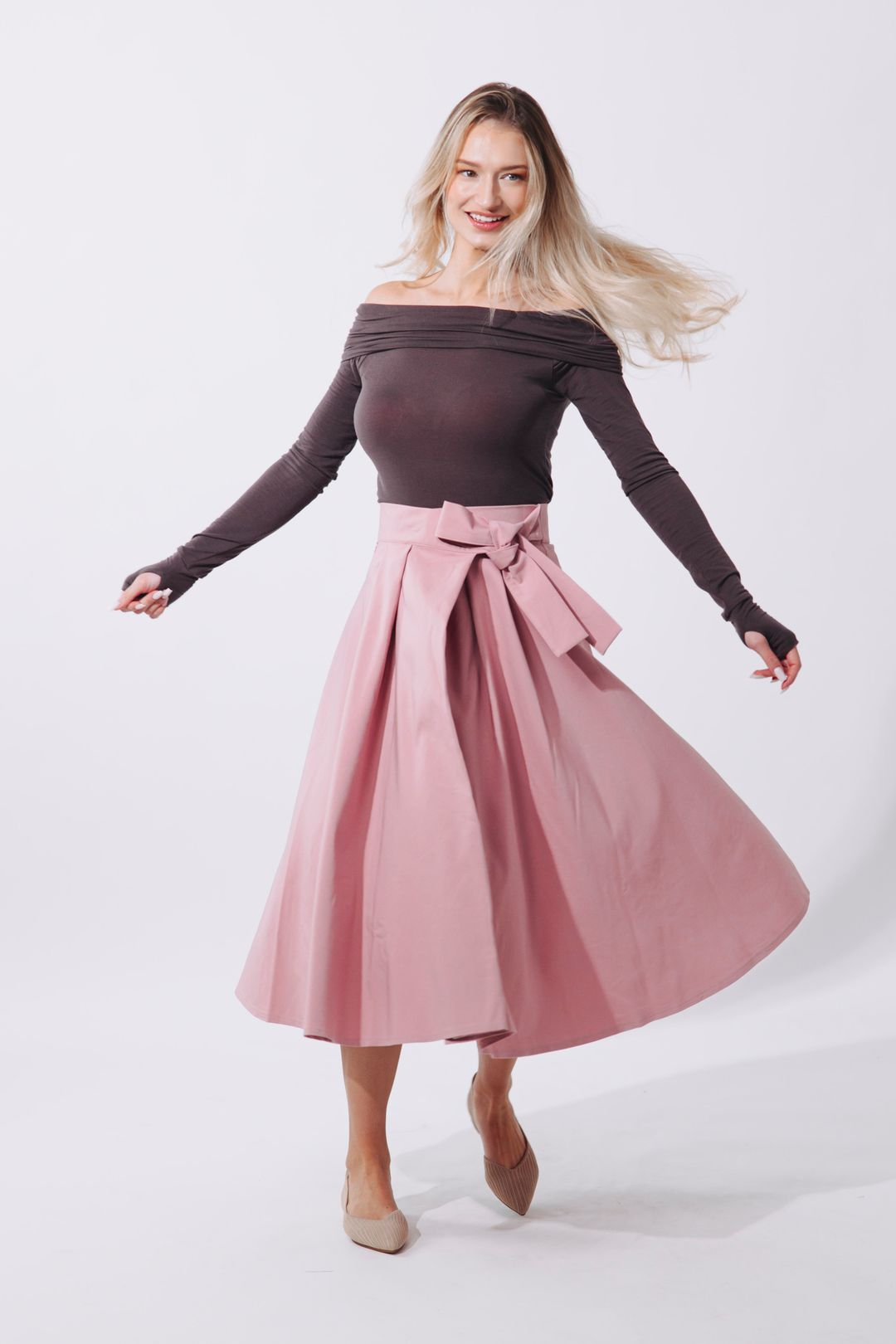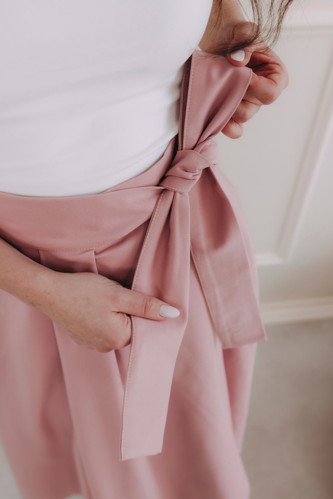 Sukňa sa zapína pomocou štyroch gombíkov a dvoch dierok, čo umožňuje nastavenie pásu presne na mieru a zaisťuje, že krásne drží tam, kde má. Mašľa v páse nie je len na ozdobu, ale slúži aj ako praktická poistka pre maximálne pohodlie a sebavedomie.