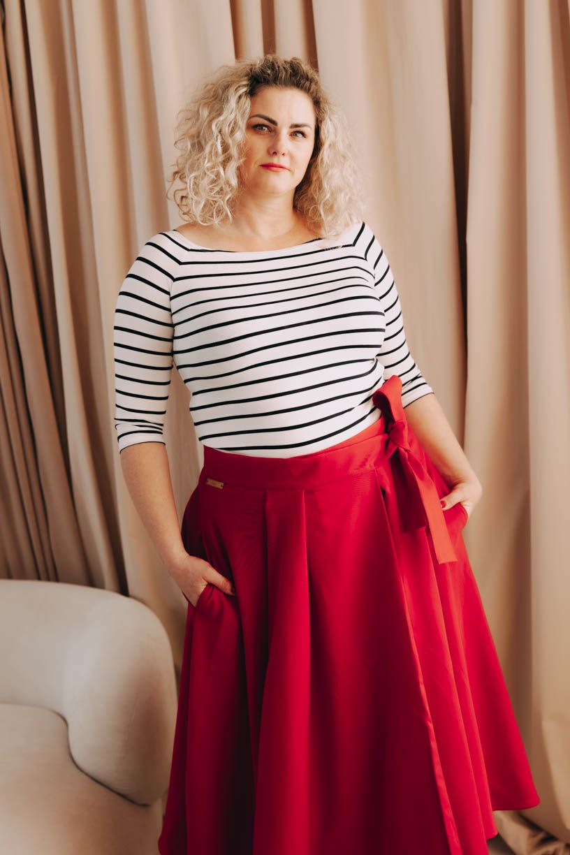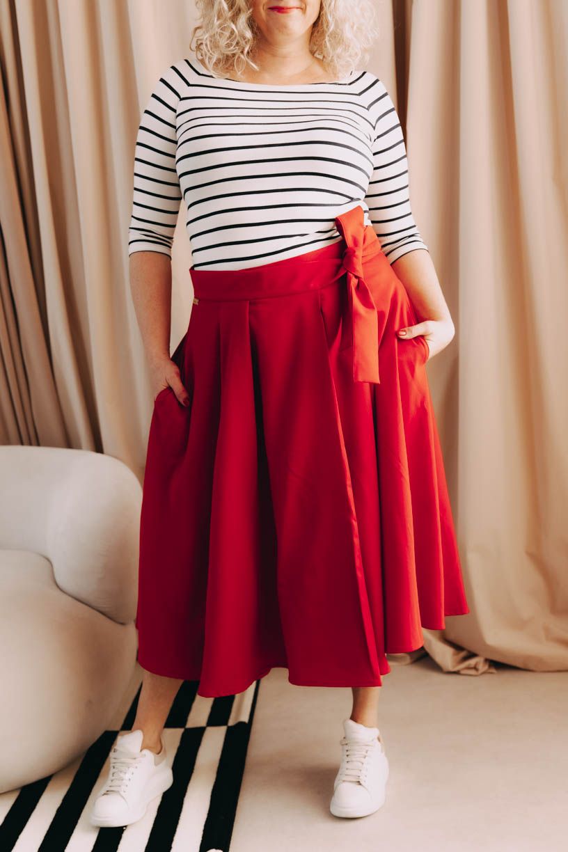 Sukňa sa zapína pomocou štyroch gombíkov a dvoch dierok, čo umožňuje nastavenie pásu presne na mieru a zaisťuje, že krásne drží tam, kde má. Mašľa v páse nie je len na ozdobu, ale slúži aj ako praktická poistka pre maximálne pohodlie a sebavedomie.