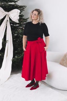 Sukňa sa zapína pomocou štyroch gombíkov a dvoch dierok, čo umožňuje nastavenie pásu presne na mieru a zaisťuje, že krásne drží tam, kde má. Mašľa v páse nie je len na ozdobu, ale slúži aj ako praktická poistka pre maximálne pohodlie a sebavedomie.