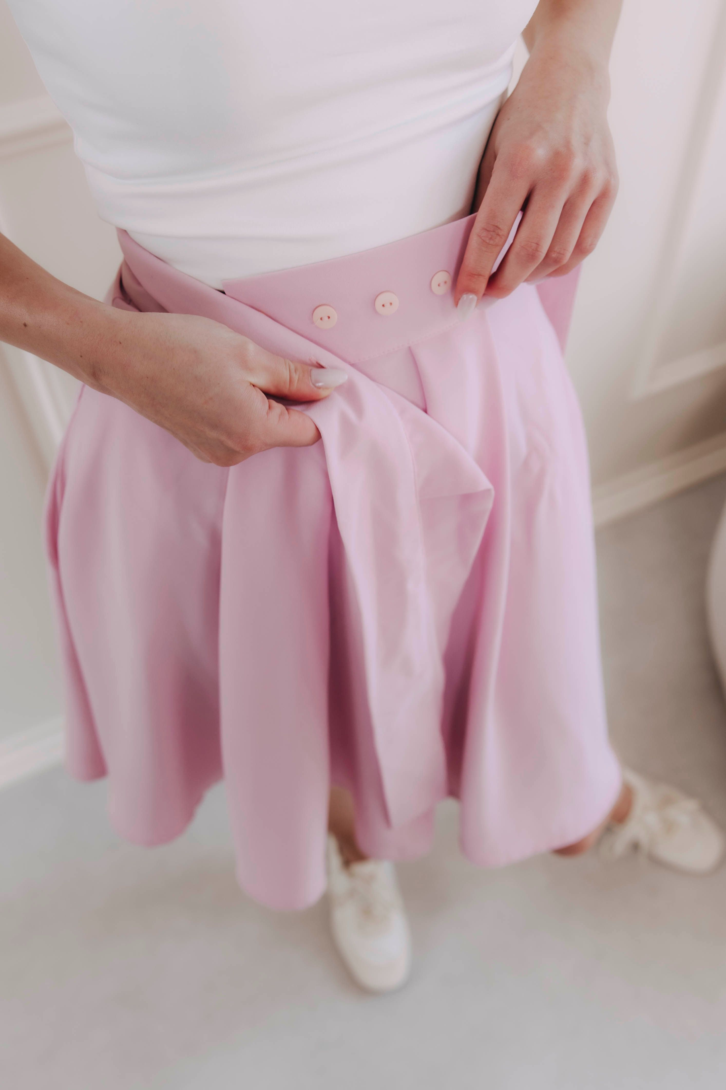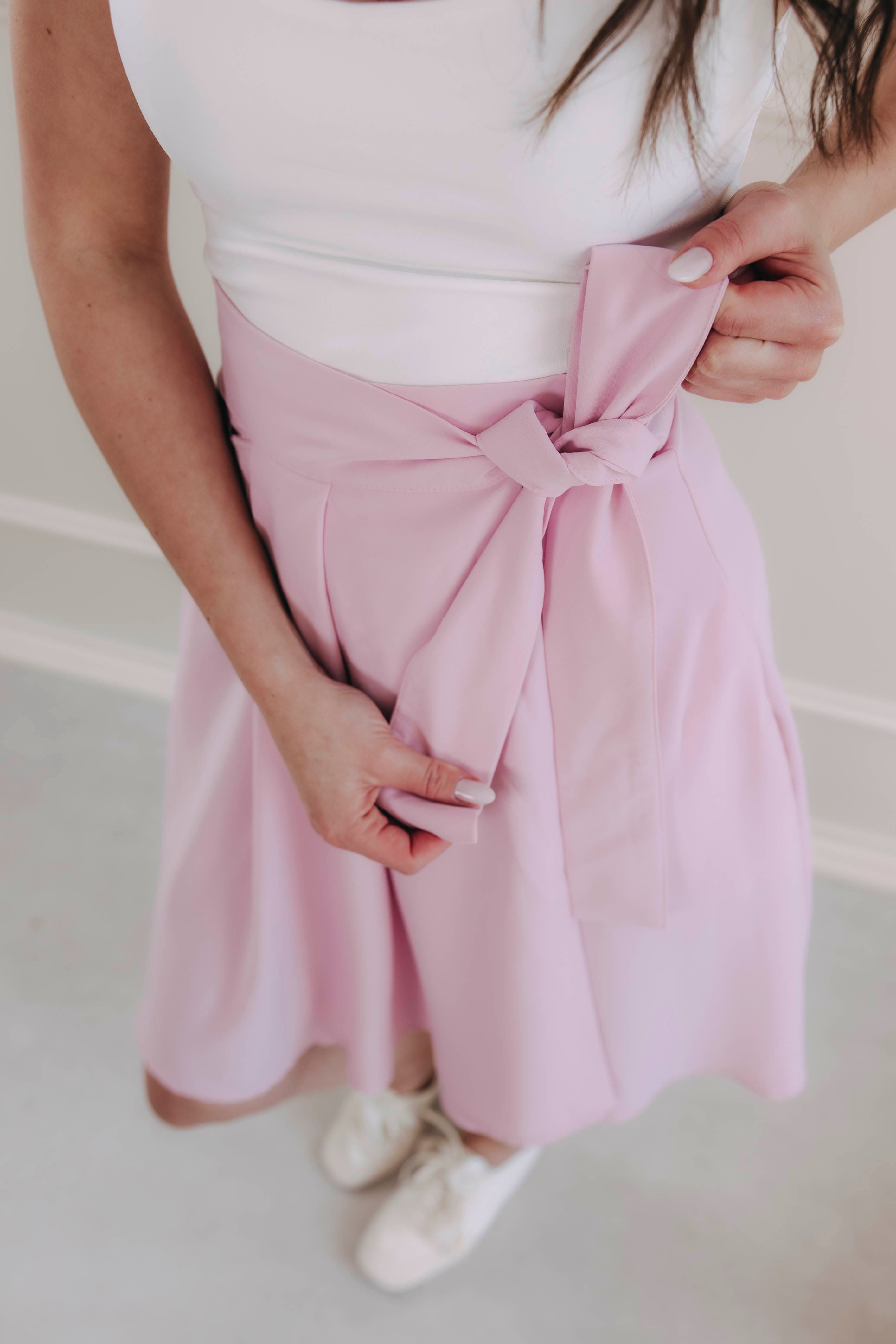 Svetloružová áčková sukňa Mawe si v ničom nezaostáva za svojou staršou sestrou. Zavinovacia, pohodlná, skvele kombinovateľná – jednoducho rovnako skvelá. Len o trochu kratšia.