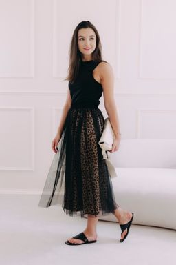 Čierna sukňa Tia s leopardím vzorom a prekrytá pôsobivou tylovou látkou. Budete v nej tak trochu princezná, tak trochu punk. Stále však štýlová.