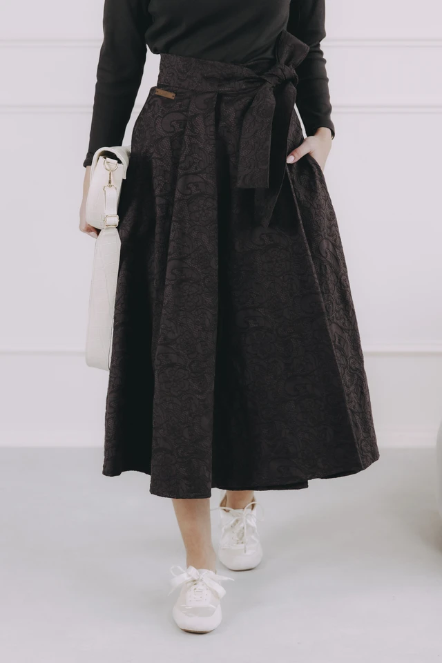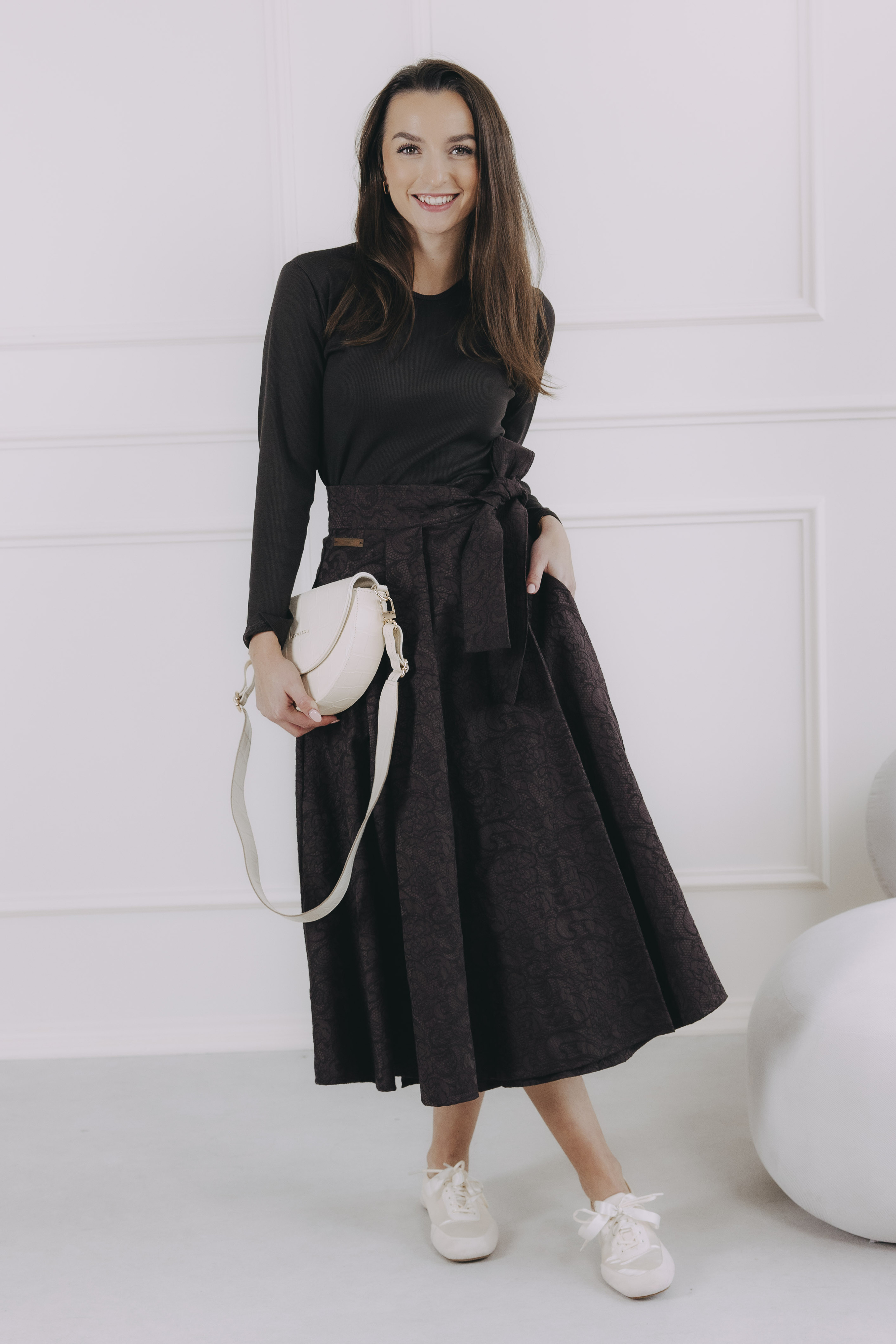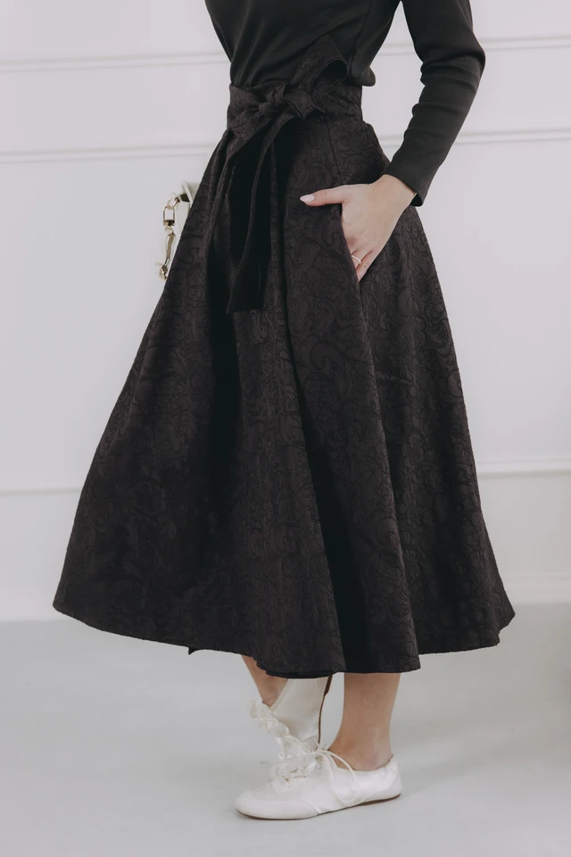 Sukňa sa zapína pomocou štyroch gombíkov a dvoch dierok, čo umožňuje nastavenie pásu presne na mieru a zaisťuje, že krásne drží tam, kde má. Mašľa v páse nie je len na ozdobu, ale slúži aj ako praktická poistka pre maximálne pohodlie a sebavedomie.