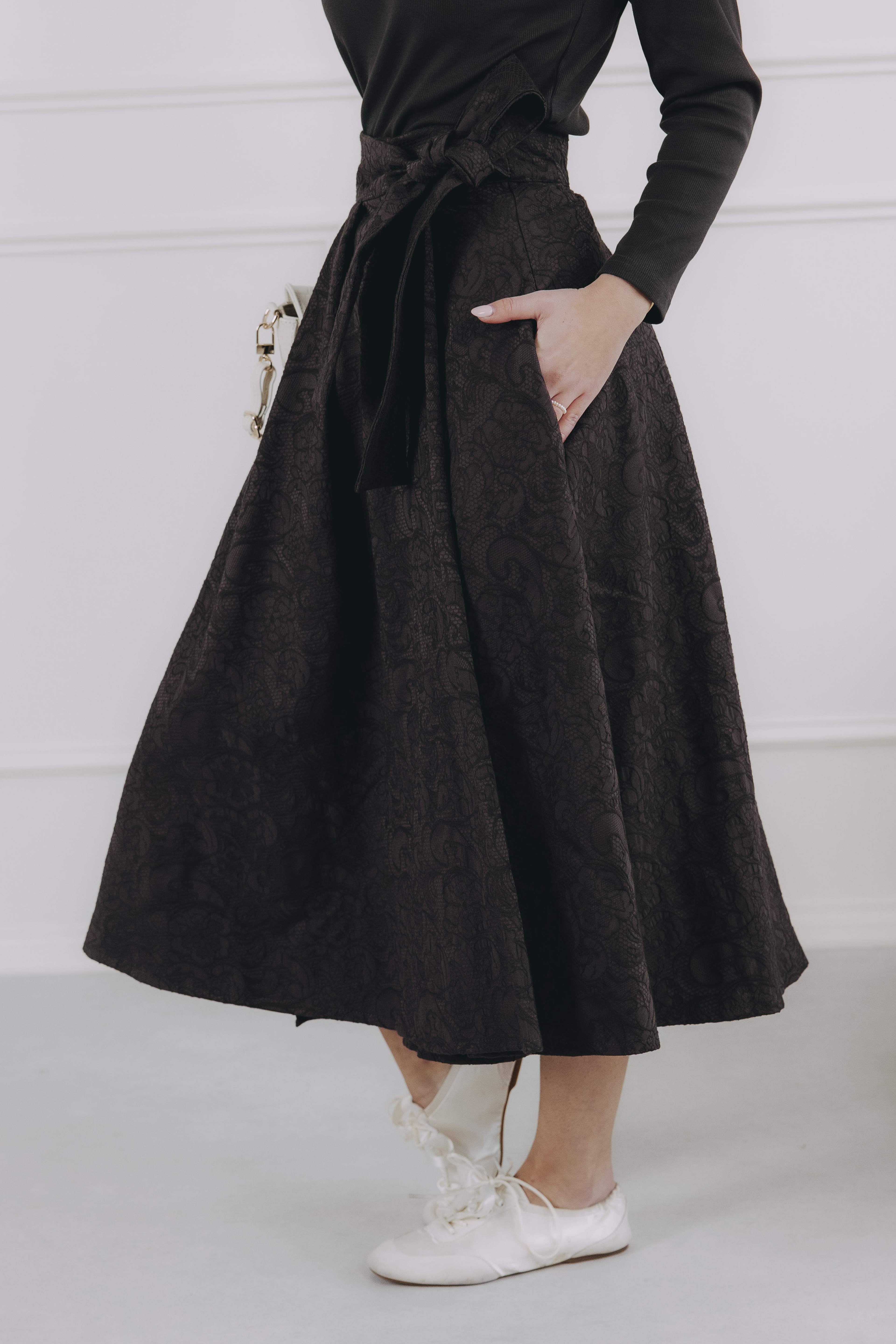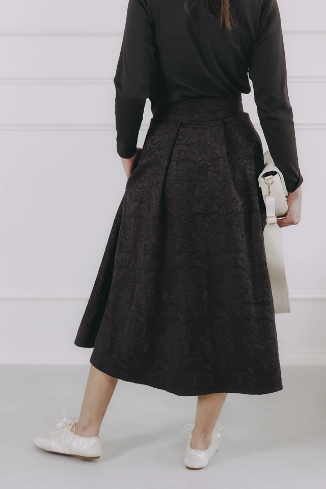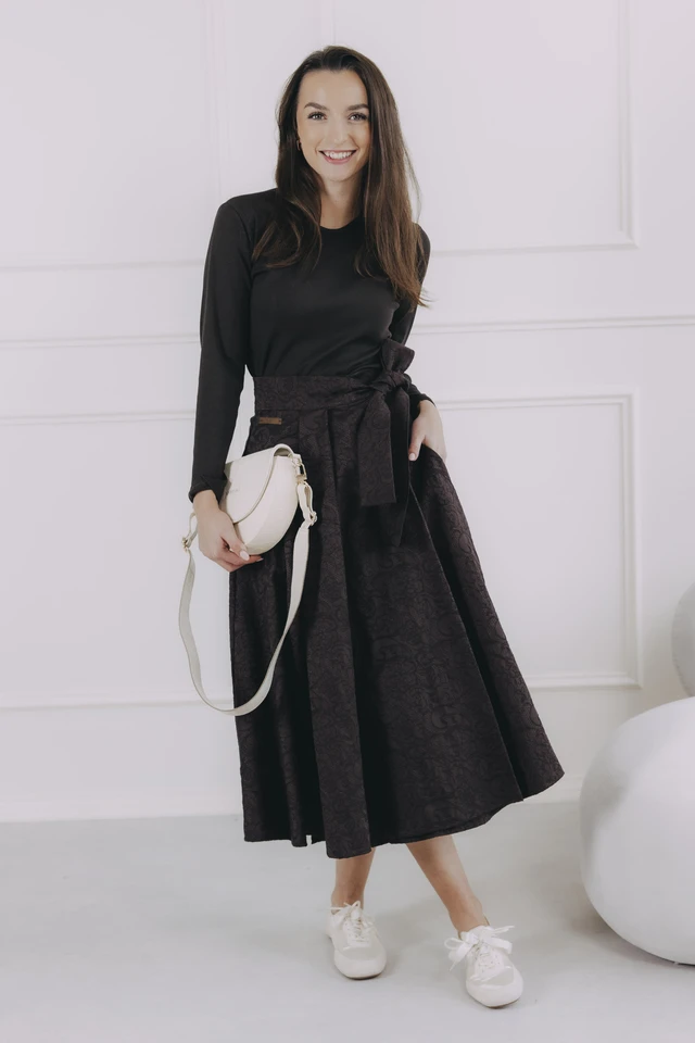 - Materiál: Žakár. Látka, ktorá pôsobí takmer ako šperk. Vzory nie sú potlačené, ale vtkané priamo do látky, vďaka čomu majú hĺbku, vydržia dlho krásne a dodávajú sukni originálny štruktúrovaný vzhľad.