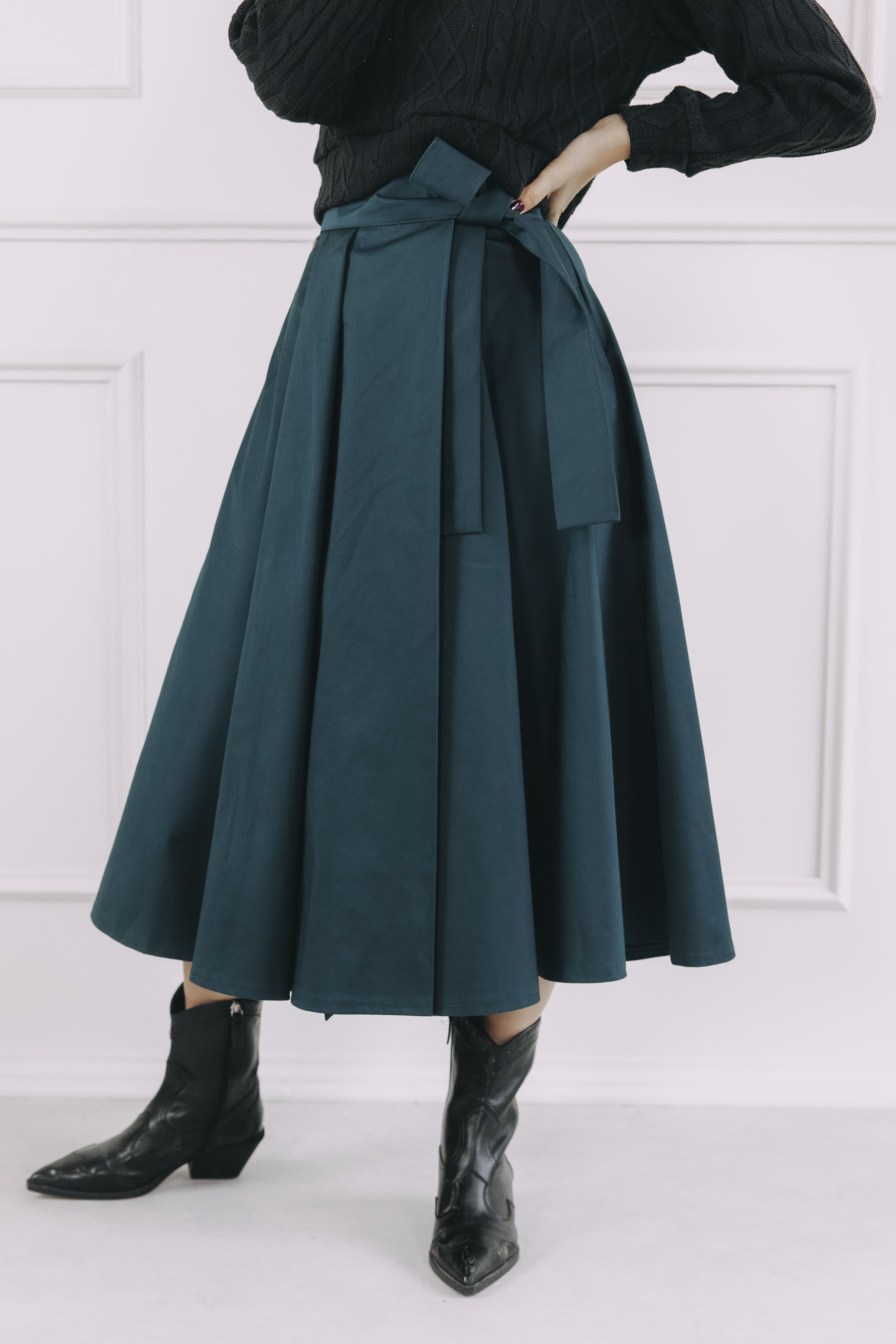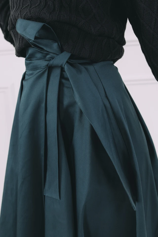 Sukňa sa zapína pomocou štyroch gombíkov a dvoch dierok, čo umožňuje nastavenie pásu presne na mieru a zaisťuje, že krásne drží tam, kde má. Mašľa v páse nie je len na ozdobu, ale slúži aj ako praktická poistka pre maximálne pohodlie a sebavedomie.