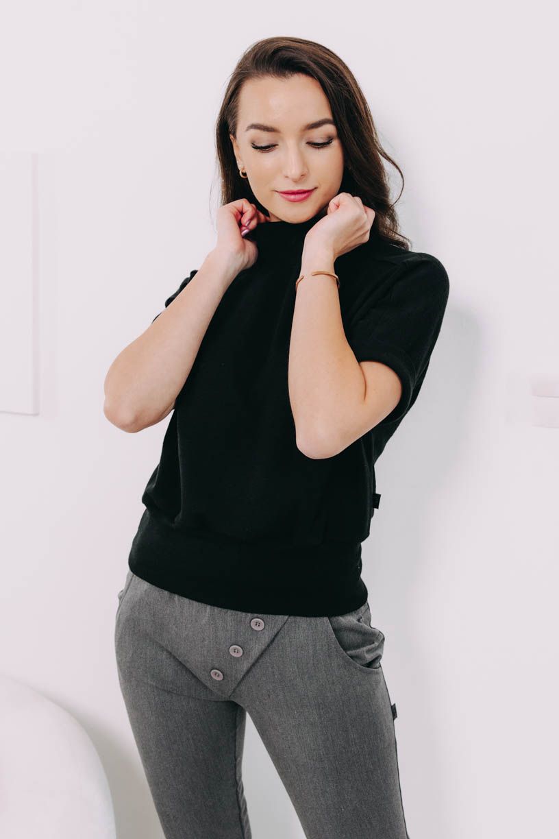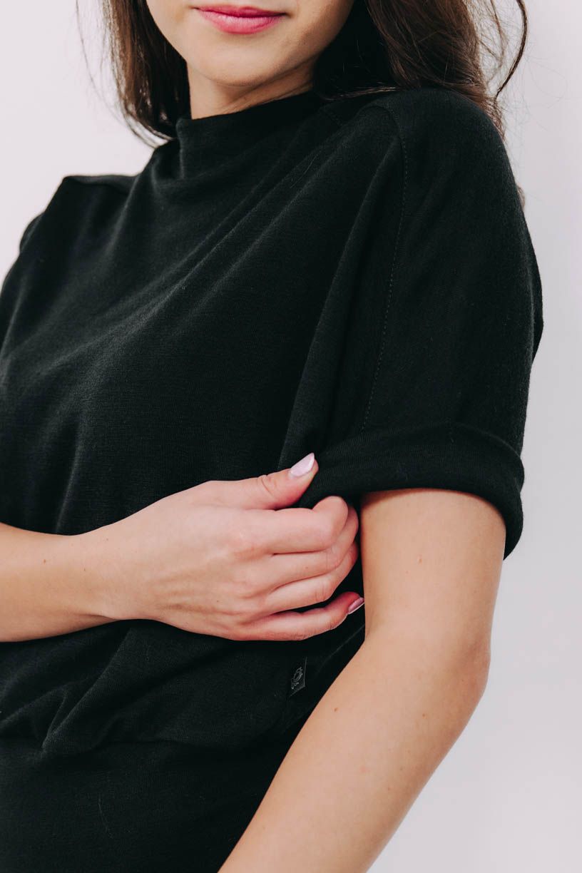 Nadčasový, odolný, skladný a nečakane minimalistický čierny sveter Tabia z prémiovej merino vlny, s krátkym rukávom a stojačikom budete milovať po zvyšok života.