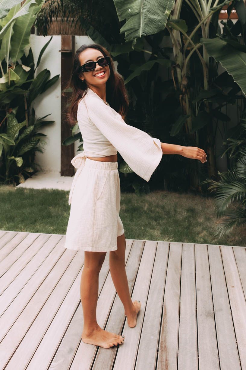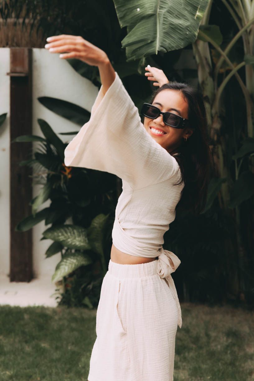 Top Akosua očarí nápaditými širokými rukávmi a sofistikovaným zaväzovaním na chrbte. Ležérne, elegantné a ideálne na letné dobrodružstvo.