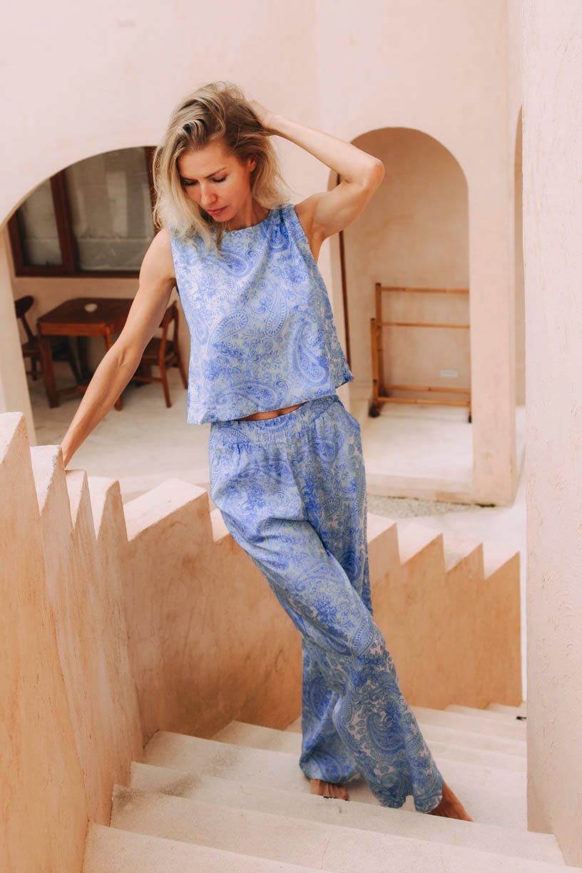 Chladivá viskóza vás bude príjemne hladkať na holom tele, neobvyklý paisley vzor vás zase ozdobí vo svojej nápaditej, ale krehkej modro-bielej kombinácii.