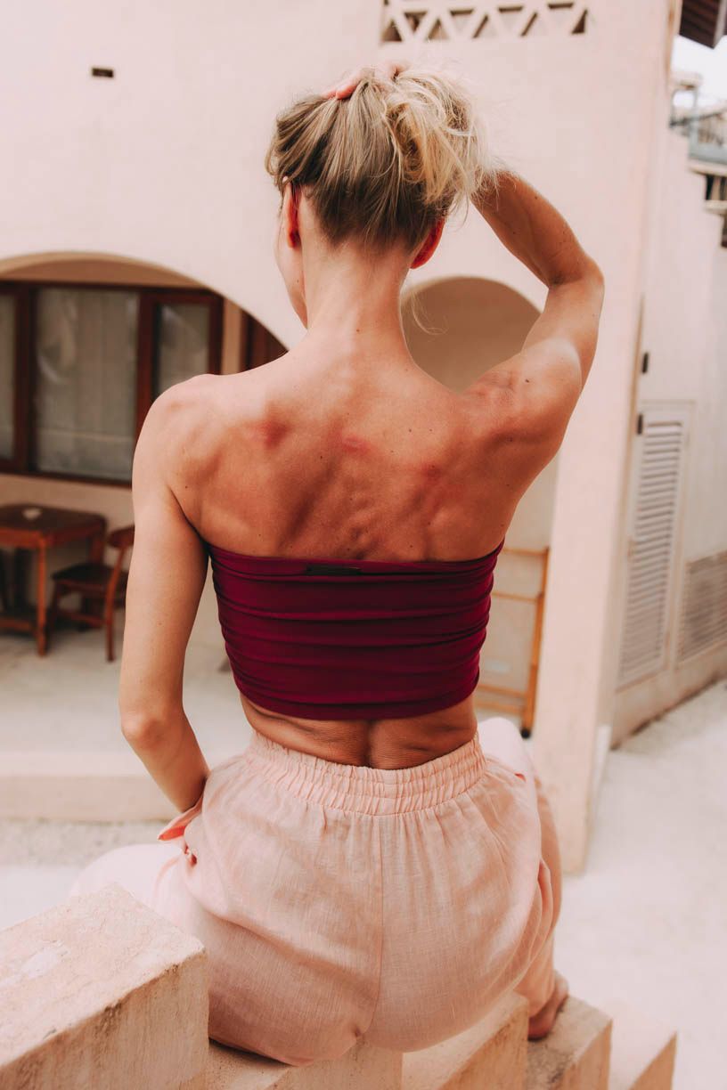 Je bez ramienok, ale predsa perfektne drží. Uzlový efekt v prednej časti krásne podčiarkne ženské prednosti. Bavlna zaručí komfort aj v tých najväčších horúčavách, troška elastanu potom pružnosť a stálosť. Takže odhaliť svoje opálené telo a ide sa na parket!
