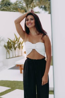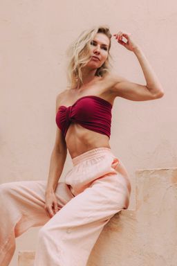 Je bez ramienok, ale predsa perfektne drží. Uzlový efekt v prednej časti krásne podčiarkne ženské prednosti. Bavlna zaručí komfort aj v tých najväčších horúčavách, troška elastanu potom pružnosť a stálosť. Takže odhaliť svoje opálené telo a ide sa na parket!
