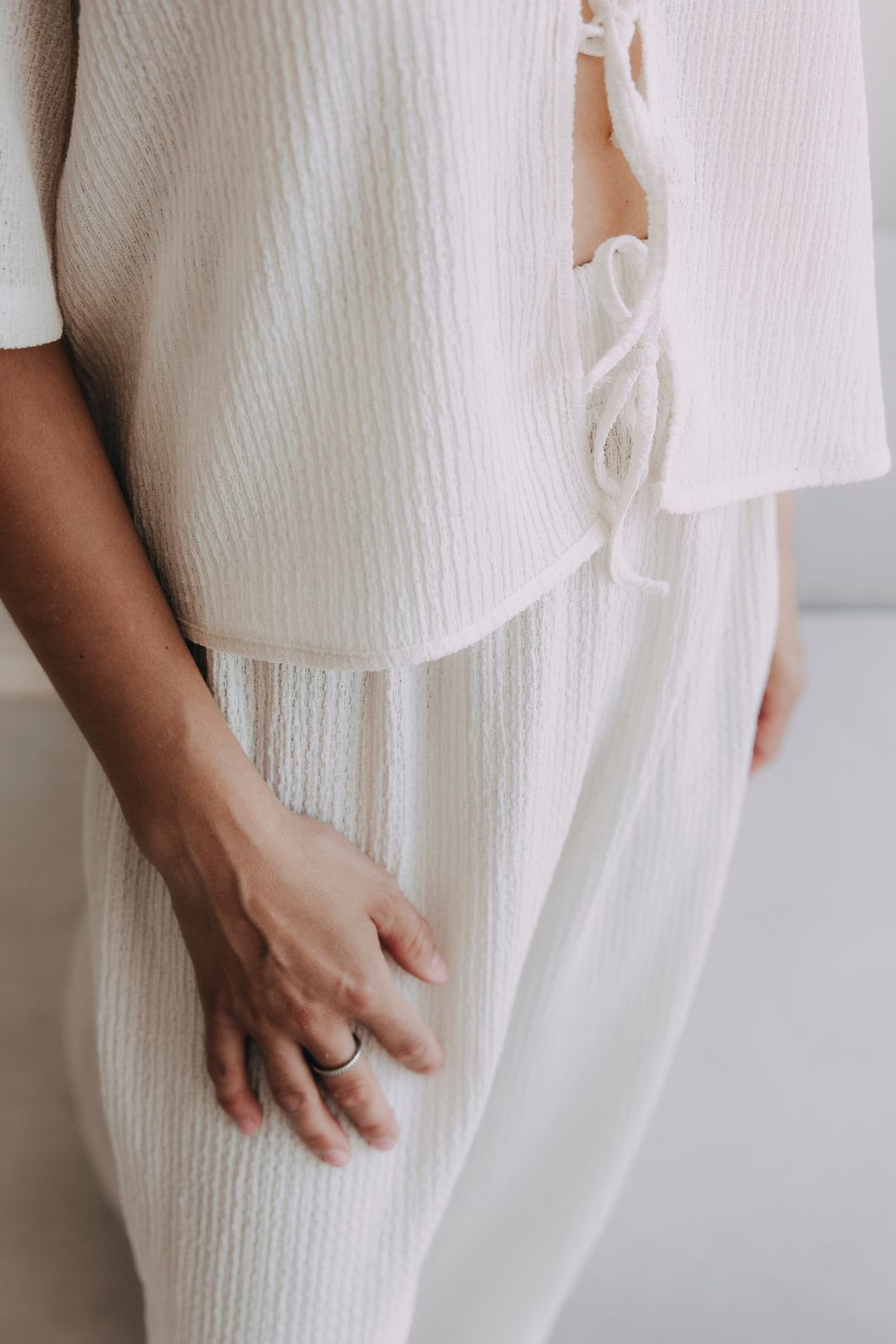 Top Kamau je ako letný vánok v sparnom dni: vzdušný, ľahký, príjemne nespútaný. Voľný strih so širokými rukávmi, ktoré siahajú pod lakte, vám dopraje komfort aj počas najväčších horúčav, zatiaľ čo elegantné trojité viazanie na prednej strane pridáva na hravosti a ženskosti.
